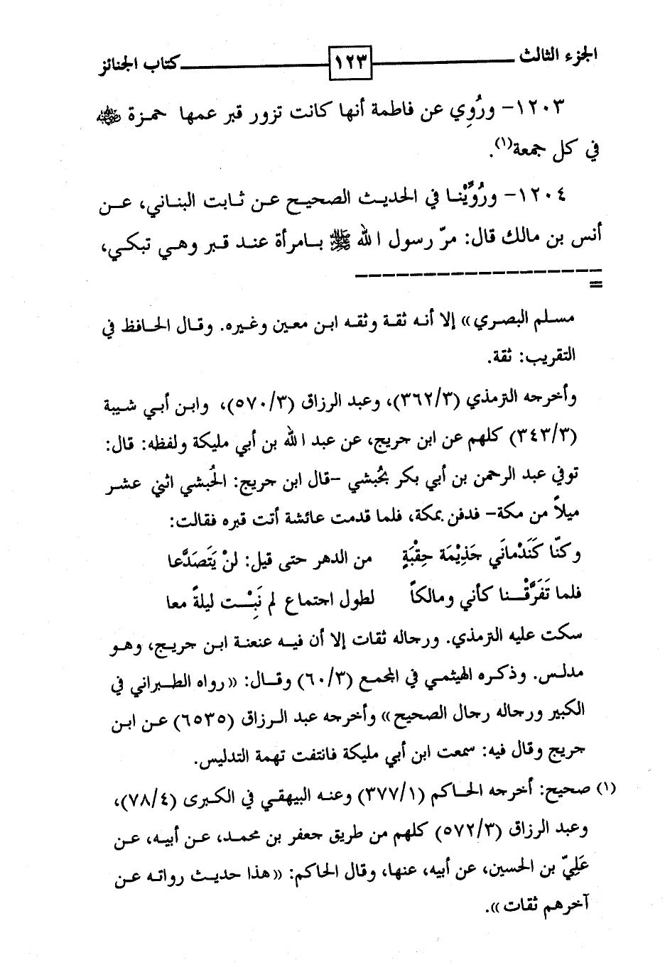 1203 - ورُوِي عن فاطمة أنها كانت تزور قبر عمها حمزة ( رضي الله عنه ) في كل جمعة ( 1 ) .