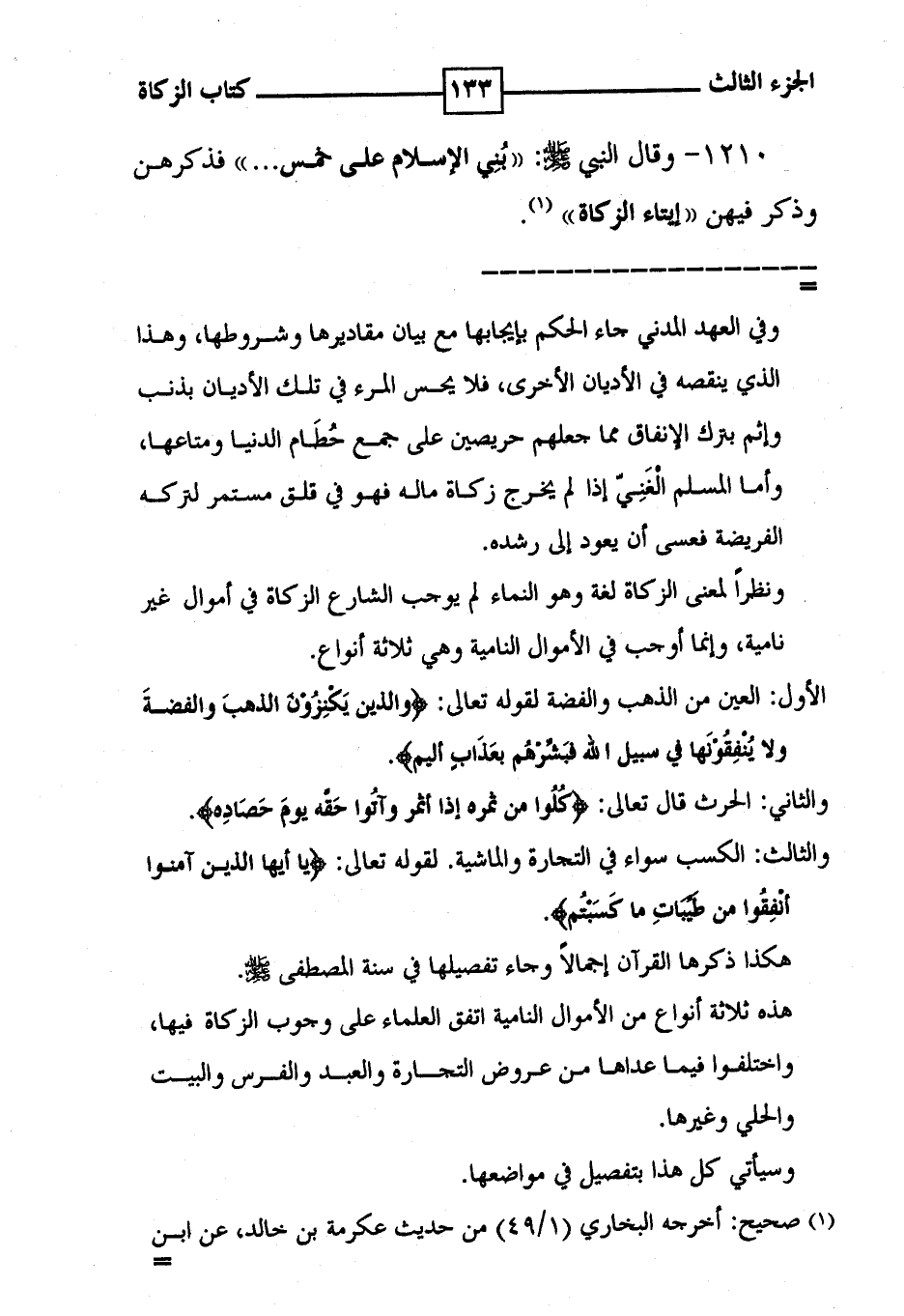 1210 - وقال النبي [ صلى الله عليه وسلم ] : ' بُنِي الإسلام على خمس . . . ' فذكرهن وذكر فيهن ' إيتاء الزكاة ' ( 1 ) .