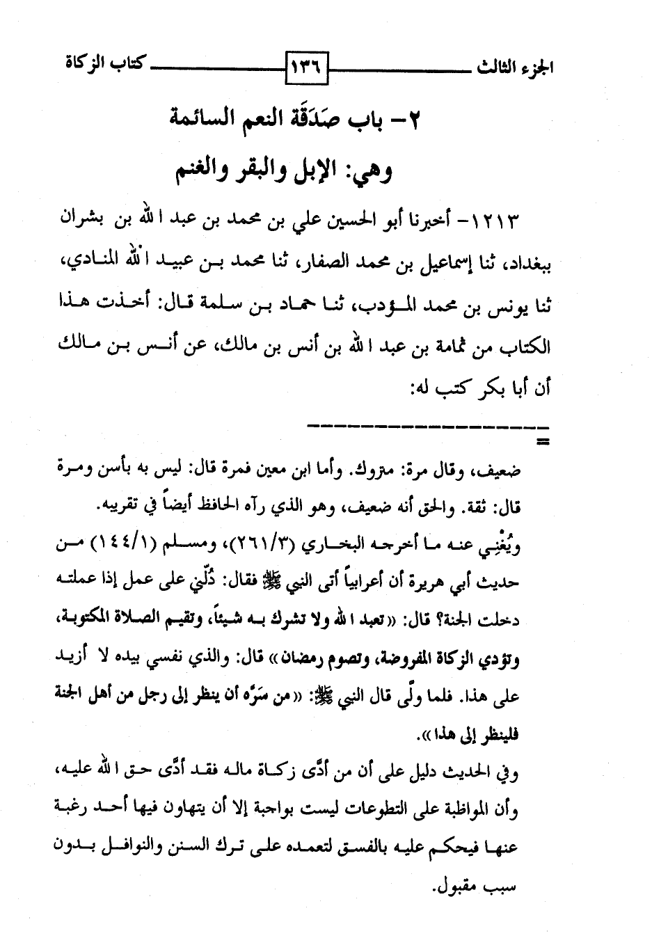 1213 - أخبرنا أبو الحسين علي بن محمد بن عبد الله بن بشران ببغداد ، ثنا إسماعيل بن محمد الصفار ، ثنا محمد بن عبيد الله المنادي ، ثنا يونس بن محمد المؤدب ، ثنا حماد بن سلمة قال : أخذت هذا الكتاب من ثمامة بن عبد الله بن أنس بن مالك ، عن أنس بن مالك أن أبا بكر كتب له :