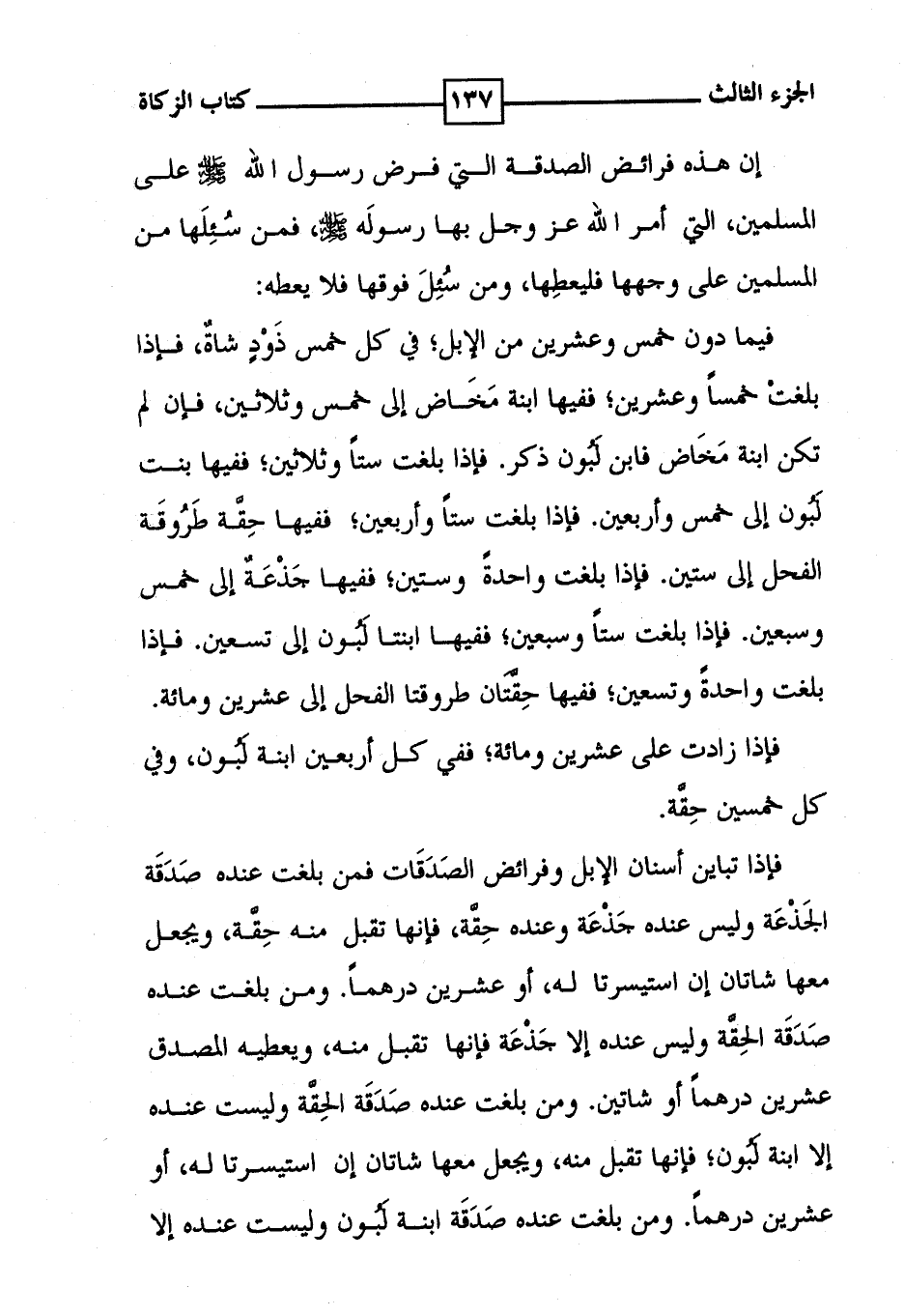 إن هذه فرائض الصدقة التي فرض رسول الله [ صلى الله عليه وسلم ] على المسلمين ، التي أمر الله عز وجل بها رسول الله [ صلى الله عليه وسلم ] ، فمن سُئِلَها من المسلمين على وجهها فليعطِها ، ومن سُئِلَ فوقها فلا يعطه : فيما دون خمس وعشرين من الإبل ؛ في كل خمس ذَوْدٍ شاةٌ ، فإذا بلغتْ خمساً وعشرين ؛ ففيها ابنة مَخَاض إلى خمس وثلاثين ، فإن لم تكن ابنة مَخَاض فابن لَبُون ذكر . فإذا بلغت ستاً وثلاثين ؛ ففيها بنت لَبُون إلى خمس وأربعين . فإذا بلغت ستاً وأربعين ؛ ففيها حِقَّة طَرُوقَة الفحل إلى ستين . فإذا بلغت واحدةً وستين ؛ ففيها جَذْعَةٌ إلى خمس وسبعين . فإذا بلغت ستا وسبعين ؛ ففيها ابنتا لَبُون إلى تسعين . فإذا بلغت واحدةً وتسعين ؛ ففيها حِقَّتان طروقتا الفحل إلى عشرين ومائة فإذا زادت على عشرين ومائة ؛ ففي كل أربعين ابنة لَبون ، وفي كُل خمسين حِقَّة . فإذا تباين أسنان الإبل وفرائض الصَدَاقَات فمن بلغت عنده صَدَقَة الجَذْعَة وليس عنده جَذْعَة وعنده حِقَّة ، فإنها تقبل منه حِقَّة ، ويجعل معها شاتان إن استيسرتا له ، أو عشرين درهماً . ومن بلغت عنده صَدَقَة الحِقَّة وليس عنده إلا جَذْعَة فإنها تقبل منه ، ويعطيه المصدق عشرين درهماً أو شاتين . ومن بلغت عنده صَدَقَة الحِقَّة وليست عنده إلا ابنة لَبُون ؛ فإنها تقبل منه ، ويجعل معها شاتان إن استيسرتا له ، أو عشرين درهماً . ومن بلغت عنده صَدَقَة ابنة لَبُون وليست عنده إلا