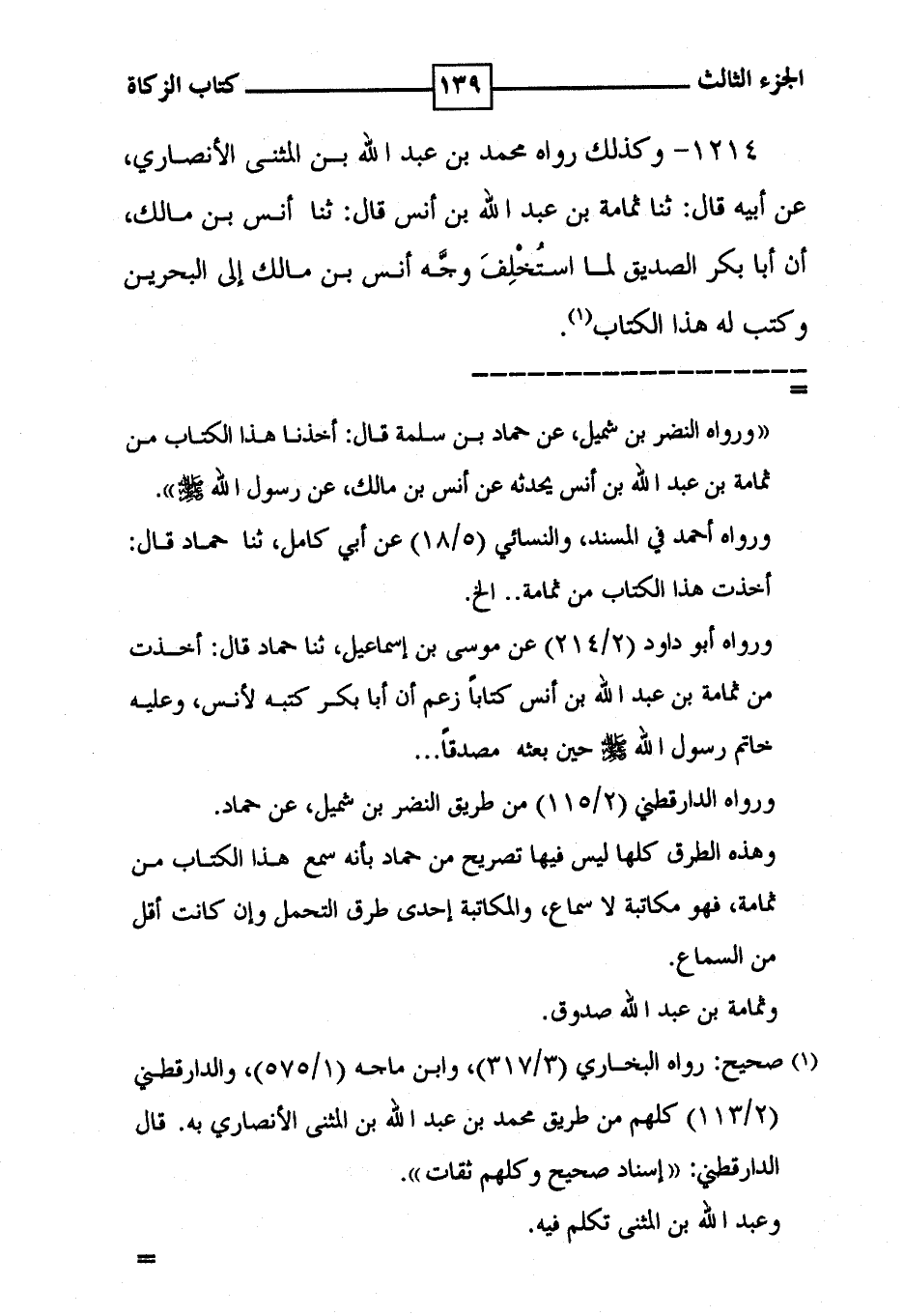 1214 - وكذلك رواه محمد بن عبد الله بن المثنى الأنصاري ، عن أبيه قال : ثنا ثمامة بن عبد الله بن أنس قال : ثنا أنس بن مالك ، أن أبا بكر الصديق لما استُخْلِفَ وجَّه أنس بن مالك إلى البحرين وكتب له هذا الكتاب ( 1 ) .
