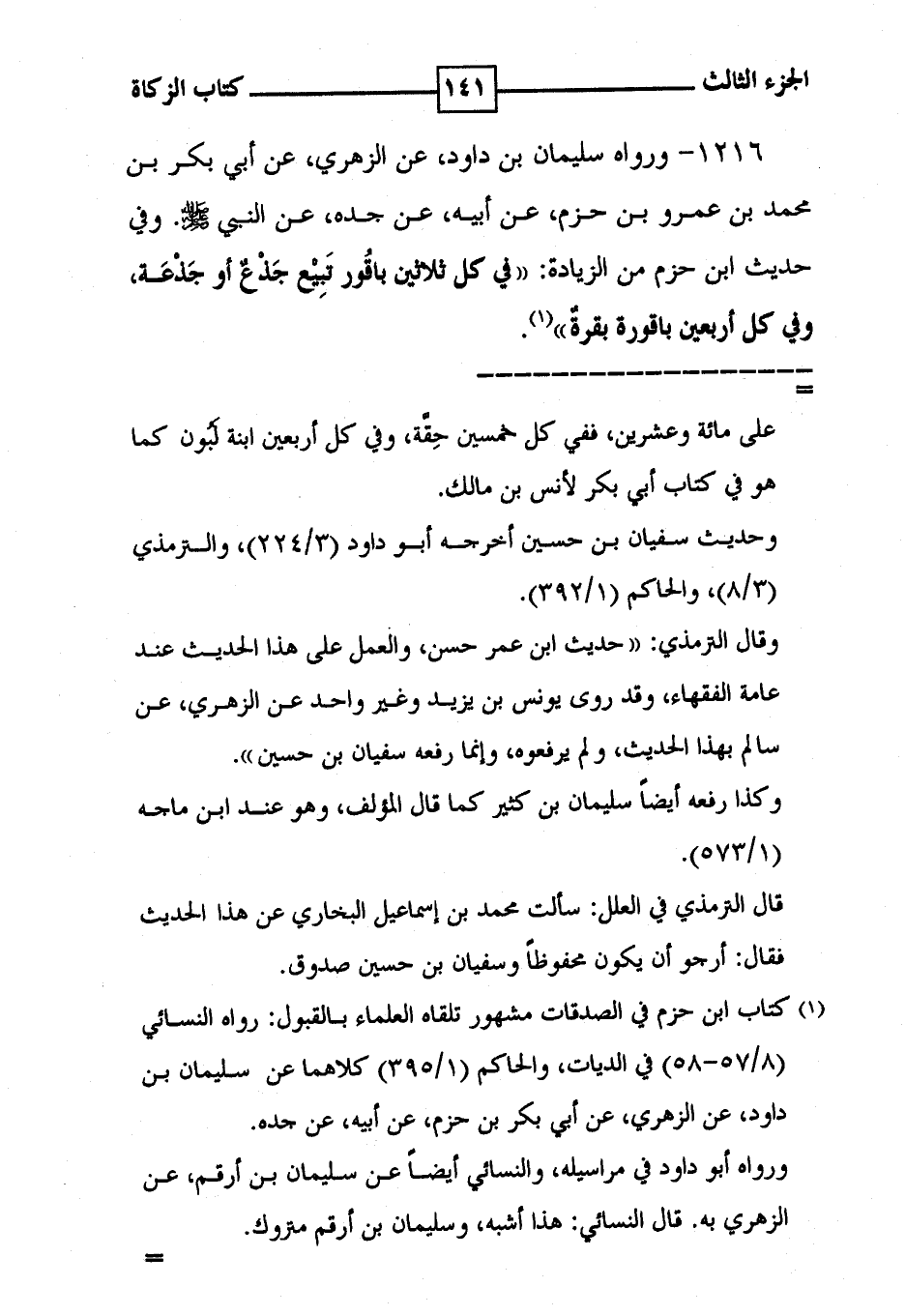 1216 - ورواه سليمان بن داود ، عن الزهري ، عن أبي بكر بن محمد بن عمر بن حزم ، عن أبيه ، عن جده ، عن النبي [ صلى الله عليه وسلم ] . وفي حديث ابن حزم من الزيادة : ' في كل ثلاثين باقُور تَبِيْع جَذْعُ أو جَذْعَة ، وفي كل أربعين باقورة بقرة ' ( 1 ) .