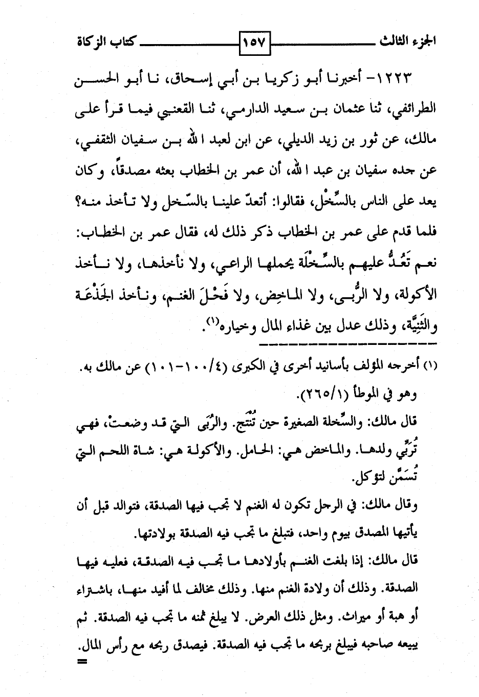 1223 - أخبرنا أبو زكريا بن أبي إسحاق ، نا أبو الحسن الطرائفي ، ثنا عثمان بن سعيد الدارمي ، ثنا القعنبي فيما قرأ على مالك ، عن ثور بن زيد الديلي ، عن ابن لعبد الله بن سفيان الثقفي ، عن جده سفيان بن عبد الله ، أن عمر بن الخطاب بعثه مصدقاً ، وكان يعد على الناس بالسِّخْل ، فقالوا : أتعدّ علينا بالسّخل ولا تأخذ منه ؟ فلما قدم على عمر بن الخطاب ذكر ذلك له ، فقال عمر بن الخطاب : نعم تَعُدُّ عليهم بالسَّخْلَة يحملها الراعي ، ولا نأخذها ، ولا نأخذ الأكولة ، ولا الرُّبى ، ولا الماخِض ، ولا فَحْلَ الغنم ، ونأخذ الجَذْعَة والثَنِيَّة ، وذلك عدل بين غذاء المال وخياره ( 1 ) .