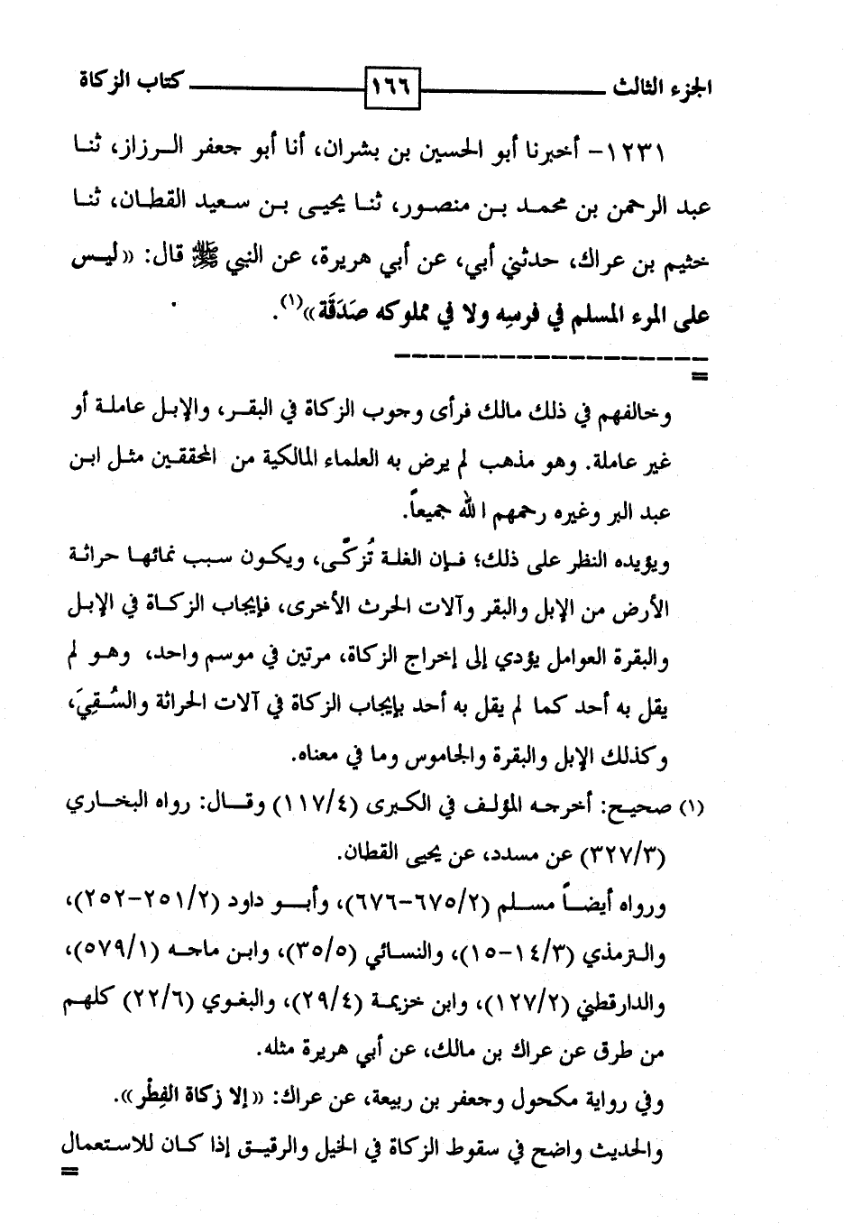 1231 - اخبرنا أبو الحسين بن بشران ، أنا أبو جعفر الرزاز ، ثنا عبد الرحمن بن محمد بن منصور ، ثنا يحيى بن سعيد القطان ، ثنا خثيم بن عراك ، حدثني أبي ، عن أبي هريرة ، عن النبي [ صلى الله عليه وسلم ] قال : ' ليس على المرء المسلم في فرسِه ولا في مملوكة صدقة ' ( 1 ) .
