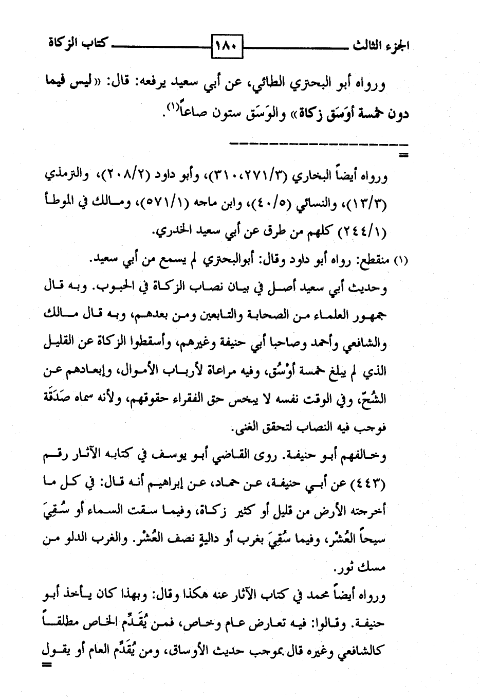 ورواه أبو البحتري الطائي ، عن أبي سعيد يرفعه : قال : ' ليس فيما دون خمسة أوَسَق زكاة ' والوَسَق ستون صاعاً ( 1 ) .