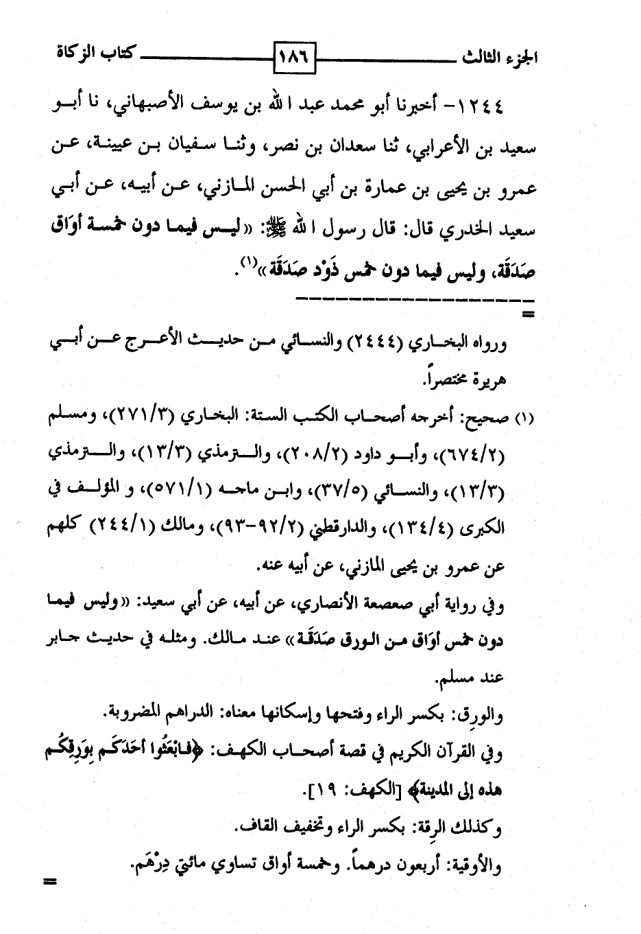 1244 - أخبرنا أبو محمد عبد الله بن يوسف الأصبهاني ، نا أبو سعيد بن الأعرابي ، ثنا سعدان بن نصر ، وثنا سفيان بن عيينة ، عن عمرو بن يحيى بن عمارة بن أبي الحسن المازني ، عن أبيه ، عن أبي سعيد الخدري قال : قال رسول الله [ صلى الله عليه وسلم ] : ' ليس فيما دون خمسة أوَاق صدَقَة وليس فيما دون خمس ذَوْد صَدَقَة ' ( 1 ) .