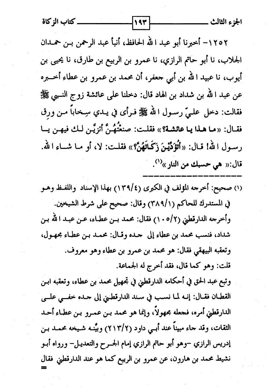 1252 - أخبرنا أبو عبد الله الحافظ ، أنبأ عبد الرحمن بن حمدان الجلاب ، نا أبو حاتم الرازي ، نا عمرو بن الربيع بن طارق ، نا يحيى بن أيوب ، نا عبيد الله بن أبي جعفر ، أن محمد بن عمرو بن عطاء أخبره عن عبد الله بن شداد بن الهاد قال : دخلنا على عائشة زوج النبي [ صلى الله عليه وسلم ] فقالت : دخل عليّ رسول الله [ صلى الله عليه وسلم ] ، فرأى في يدي سِخاباً من ورِق فقال : ' ما هذا يا عائشة ؟ ' فقلت : صنعْتُهُنَّ أتزيَّن لك فيهن يا رسول الله ! قال : ' أتؤدين زَكَاَتَهُنَّ ؟ ' فقلت : لا ، أو ما شاء الله . قال : ' هي حسبك من النار ' ( 1 ) .