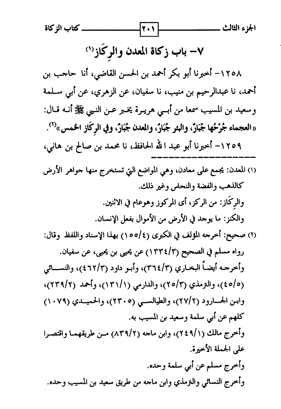 1258 - أخبرنا أبو بكر أحمد بن الحسن القاضي ، أنا حاجب بن أحمد ، نا عبد الرحيم بن منيب ، نا سفيان ، عن الزهري ، عن أبي سلمة وسعيد بن المسيب سمعا من أبي هريرة يخبر عن النبي [ صلى الله عليه وسلم ] أنه قال : ' العجماء جُرْحُها جُبَارٌ ، والبئر جُبَارٌ والمعدن جُبَارٌ ، وفي الرِكَاز الخمس ' ( 2 ) .