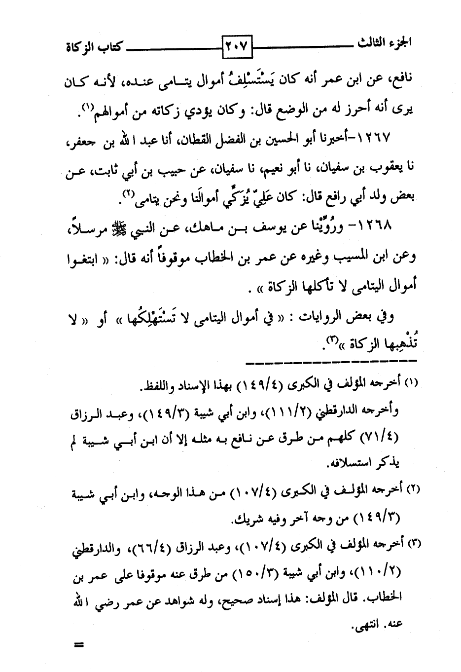 1268 - ورُوِّيْنا عن يوسف بن ماهك ، عن النبي [ صلى الله عليه وسلم ] مرسلاً ، وعن ابن المسيب وغيره عن عمر بن الخطاب موقوفاً أنه قال : ' ابتغوا أموال اليتامى لا تأكلها الزكاة ' . وفي بعض الروايات : ' في أموال اليتامى لا تَسْتَهْلِكُها ' أو ' لا تُذْهِبها الزكاة ' ( 3 ) .