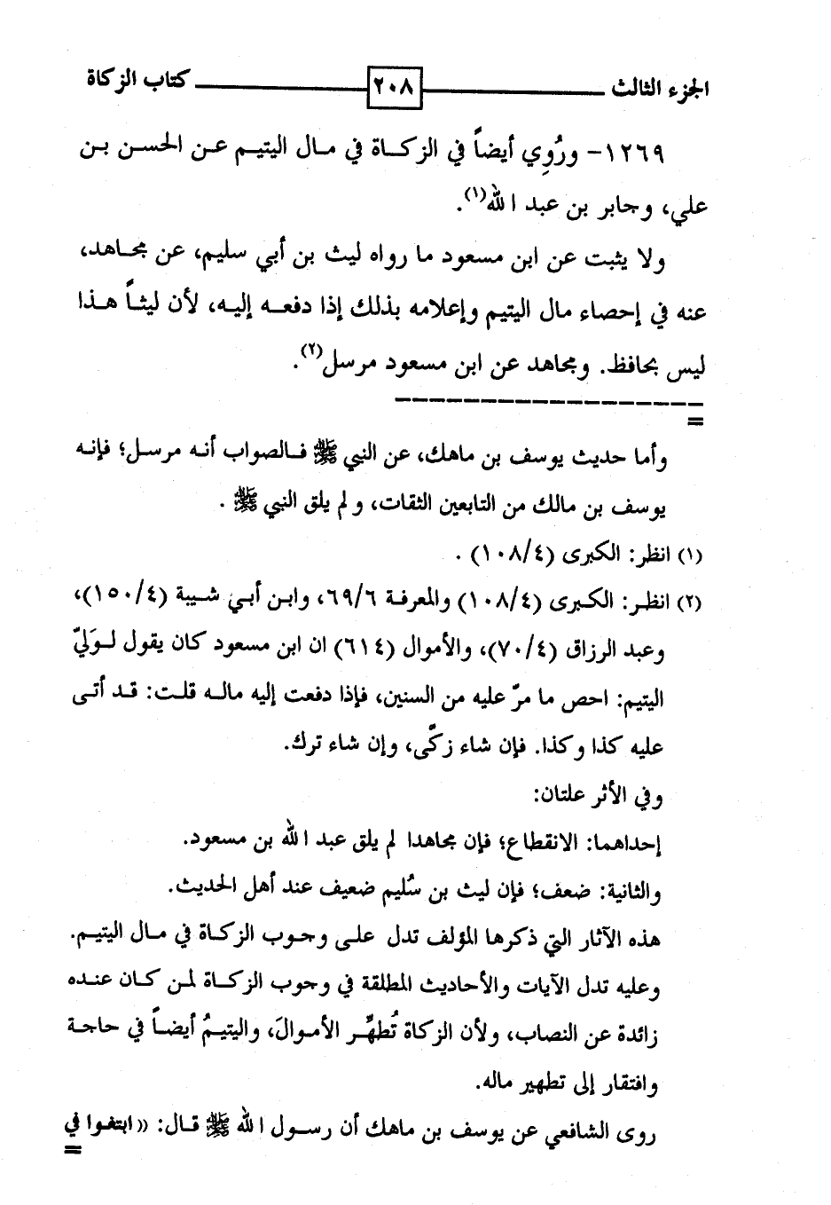 1269 - ورُوِي أيضاً في الزكاة في مال اليتيم عن الحسن بن علي ، وجابر بن عبد الله ( 1 ) . ولا يثبت عن ابن مسعود ما رواه ليث بن أبي سليم ، عن مجاهد ، عنه في إحصاء مال اليتيم وإعلامه بذلك إذا دفعه إليه ، لأن ليثاً هذا ليس بحافظ . ومجاهد عن ابن مسعود مرسل ( 2 ) .