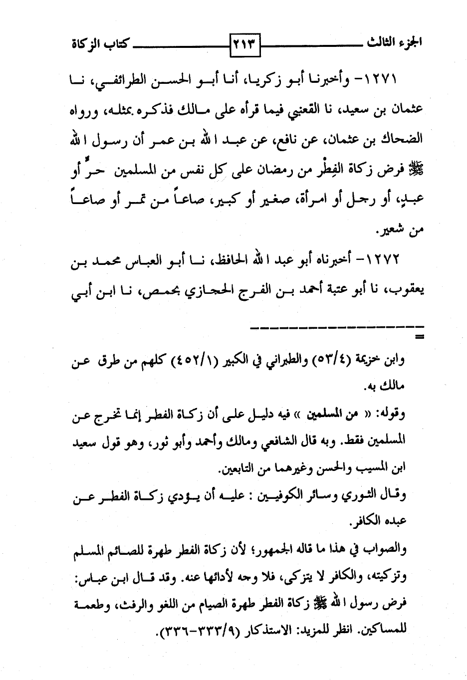 1271 - وأخبرنا أبو زكريا ، أنا أبو الحسن الطرائفي ، نا عثمان بن سعيد ، نا القعنبي فيما قرأه على مالك فذكره بمثله ، ورواه الضحاك بن عثمان ، عن نافع ، عن عبد الله بن عمر أن رسول الله [ صلى الله عليه وسلم ] فرض زكاة الفِطْر من رمضان على كل نفس من المسلمين حرِّ أو عبدٍ ، أو رجل أو امرأة ، صغير أو كبير ، صاعاً من تمر أو صاعاً من شعير .