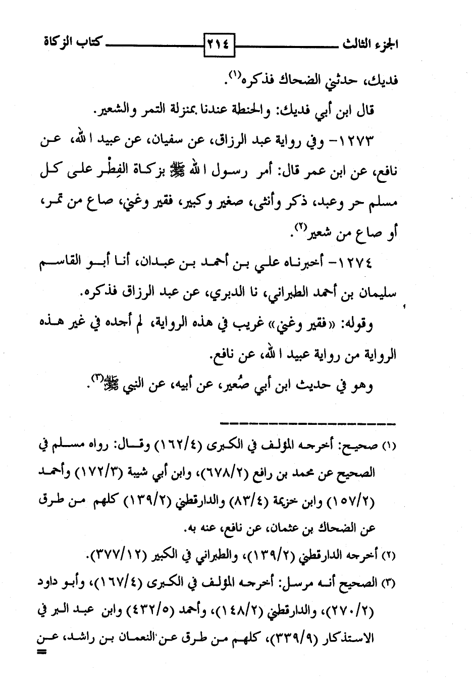 1273 - وفي رواية عبد الرزاق ، عن سفيان ، عن عبيد الله ، عن نافع ، عن ابن عمر قال : أمر رسول الله [ صلى الله عليه وسلم ] بزكاة الفِطْر على كل مسلم حر وعبد ، ذكر وأنثى ، صغير وكبير ، فقير وغني ، صاع من تمر ، أو صاع من شعير ( 2 ) .