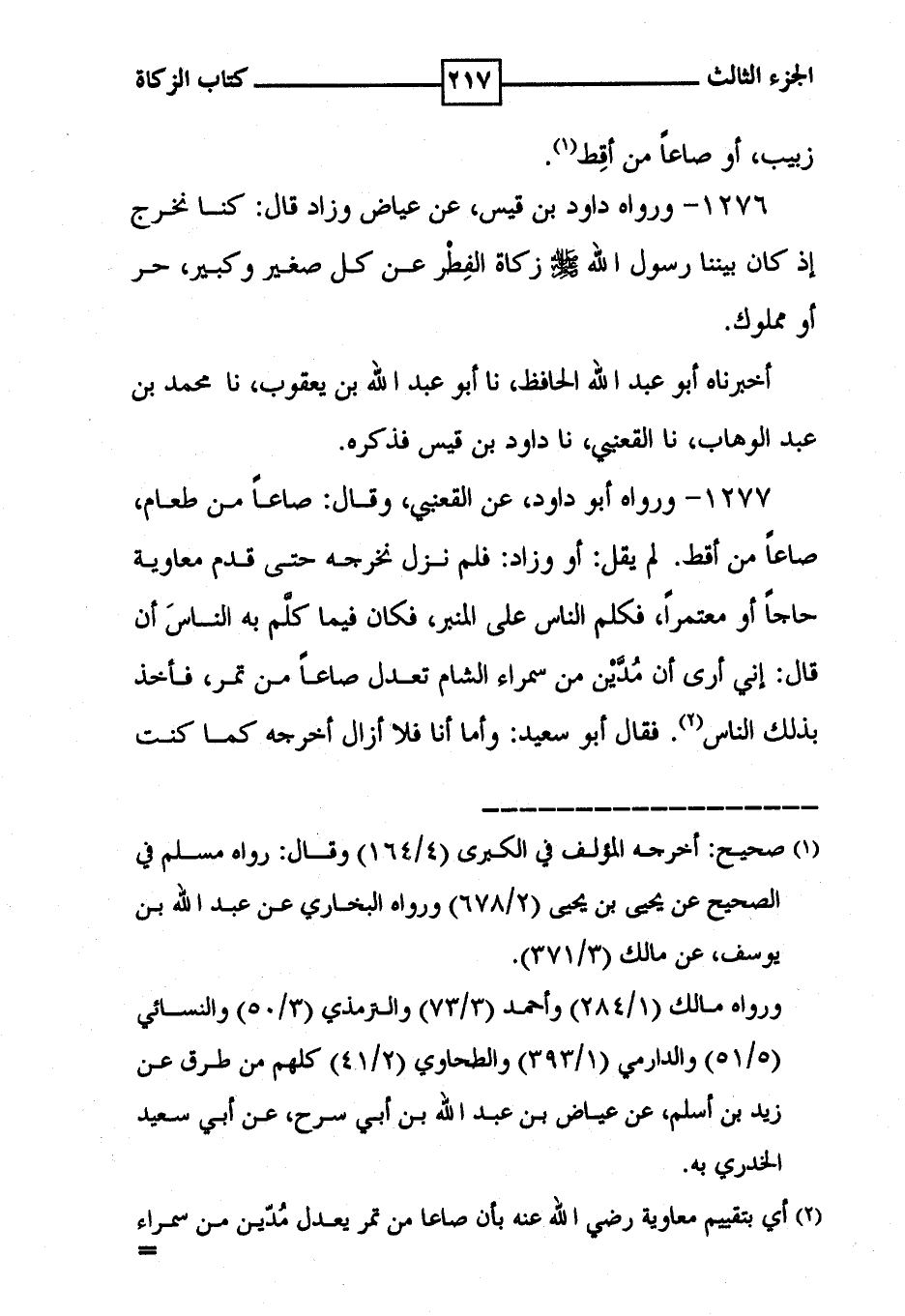 1277 - ورواه أبو داود ، عن القعنبي ، وقال : صاعاً من طعام ، صاعاً من أقط . لم يقل : أو وزاد : فلم نزل نخرجه حتى قدم معاوية حاجاً أو معتمراً ، فكلم الناس على المنبر ، فكان فيما كلَّم به الناسَ أن قال : إني أرى أن مُدَّيْن من سمراء الشام تعدل صاعاً من تمر ، فأخذ بذلك الناس ( 2 ) . فقال أبو سعيد : وأما أنا فلا أزال أخرجه كما كنت