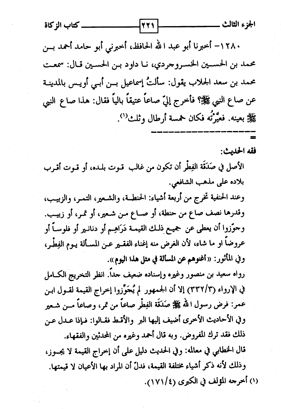 1280 - أخبرنا أبو عبد الله الحافظ ، أخبرني أبو حامد أحمد بن محمد بن الحسين الخسروجردي ، نا داود بن الحسين قال : سمعت محمد بن سعد الجلاب يقول : سألتُ إسماعيل بن أبي أويس بالمدينة عن صاع النبي [ صلى الله عليه وسلم ] ؟ فأخرج إليّ صاعاً عتيقاً بالياً فقال : هذا صاع النبي [ صلى الله عليه وسلم ] بعينه . فعيِّرْتُه فكان خمسة أرطال وثلث ( 1 ) .
