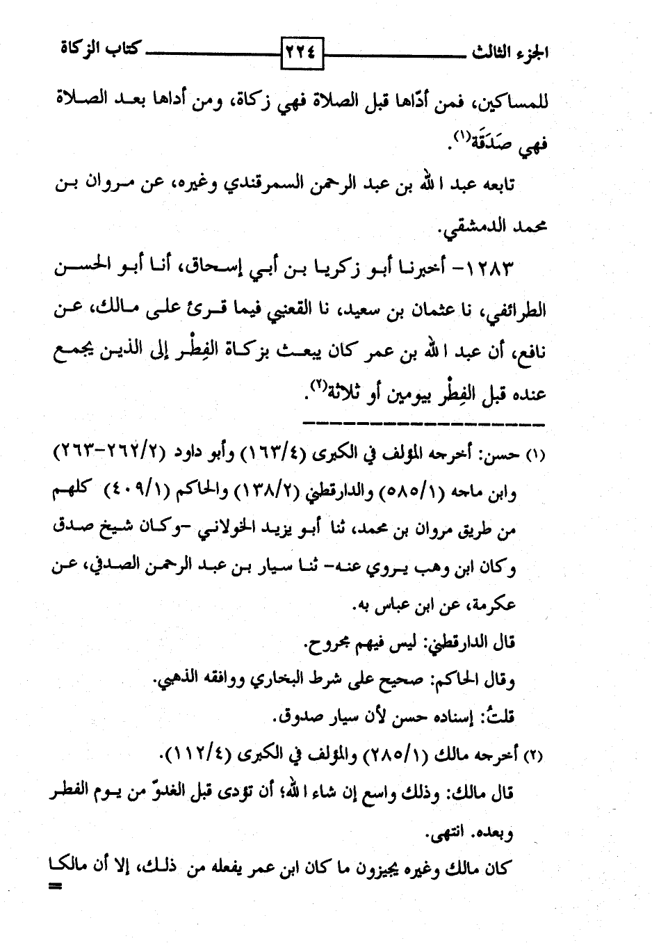 1283 - أخبرنا أبو زكريا بن أبي إسحاق ، أنا أبو الحسن الطرائفي ، نا عثمان بن سعيد ، نا القعنبي فيما قرئ على مالك ، عن نافع ، أن عبد الله بن عمر كان يبعث بزكاة الفِطْر إلى الذين يجمع عنده قبل الفِطْر بيومين أو ثلاثة ( 2 ) .