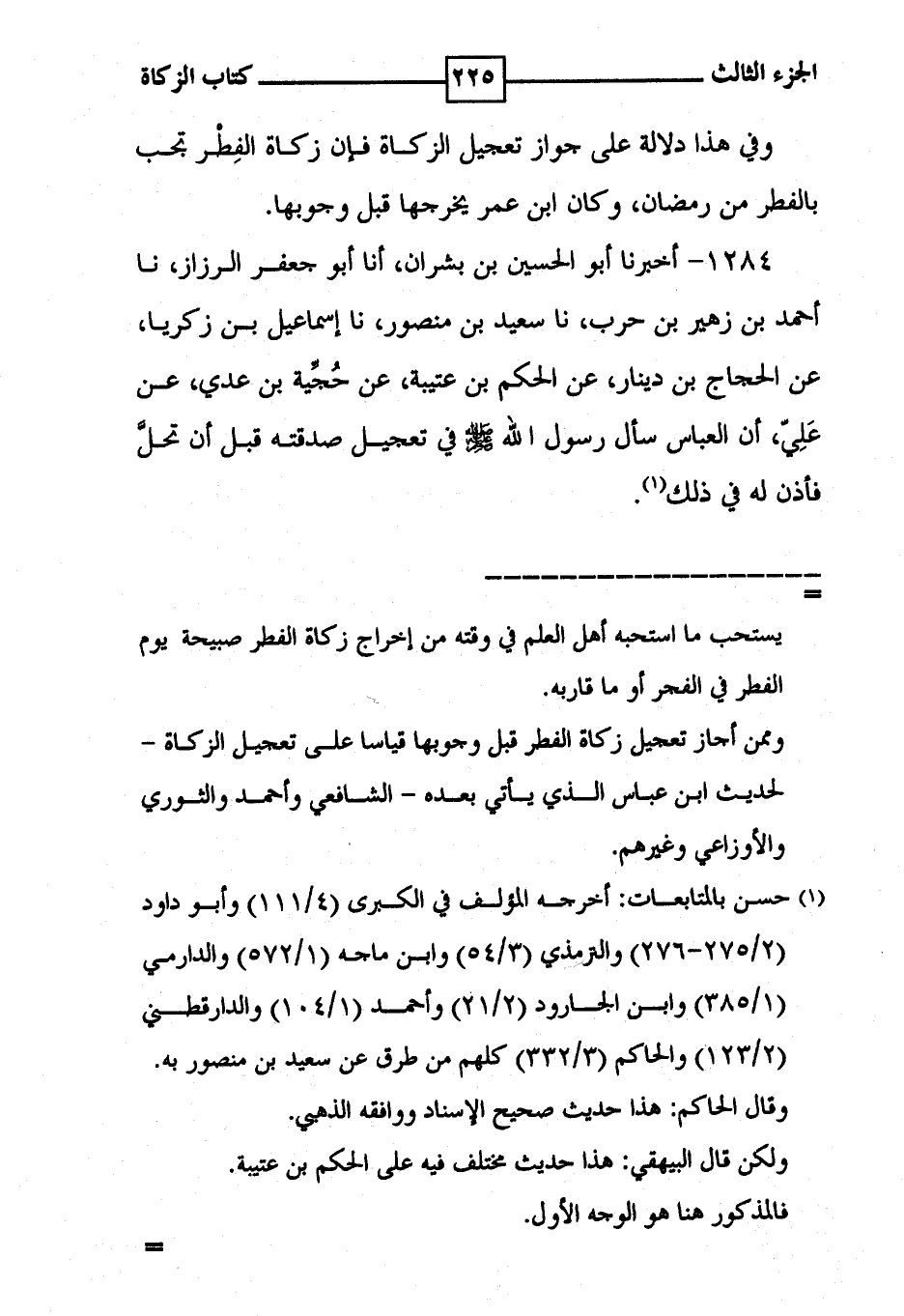 1284 - أخبرنا أبو الحسين بن بشران ، أنا أبو جعفر الرزاز ، نا أحمد بن زهير بن حرب ، نا سعيد بن منصور ، نا إسماعيل بن زكريا ، عن الحجاج بن دينار ، عن الحكم بن عتيبة ، عن حُجِّية بن عدي ، عن عَلِيّ ، أن العباس سأل رسول الله [ صلى الله عليه وسلم ] في تعجيل صدقته قبل أن تحلَّ فأذن له في ذلك ( 1 ) .