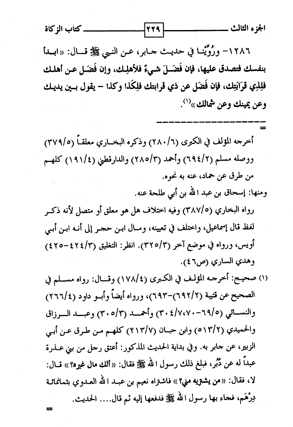 1286 - ورُوِّيْنا في حديث جابر ، عن النبي [ صلى الله عليه وسلم ] قال : ' ابدأ بنفسك فتصدق عليها ، فإن فَضَلَ شيءٌ فلأهِلك ، وإن فَضَل عن أهلك فلِذِي قرَابَتِك ، فإن فَضَل عن ذي قرابتك فلِكَذا وكذا - يقول بين يديك وعن يمينك وعن شمالك ' ( 1 ) .
