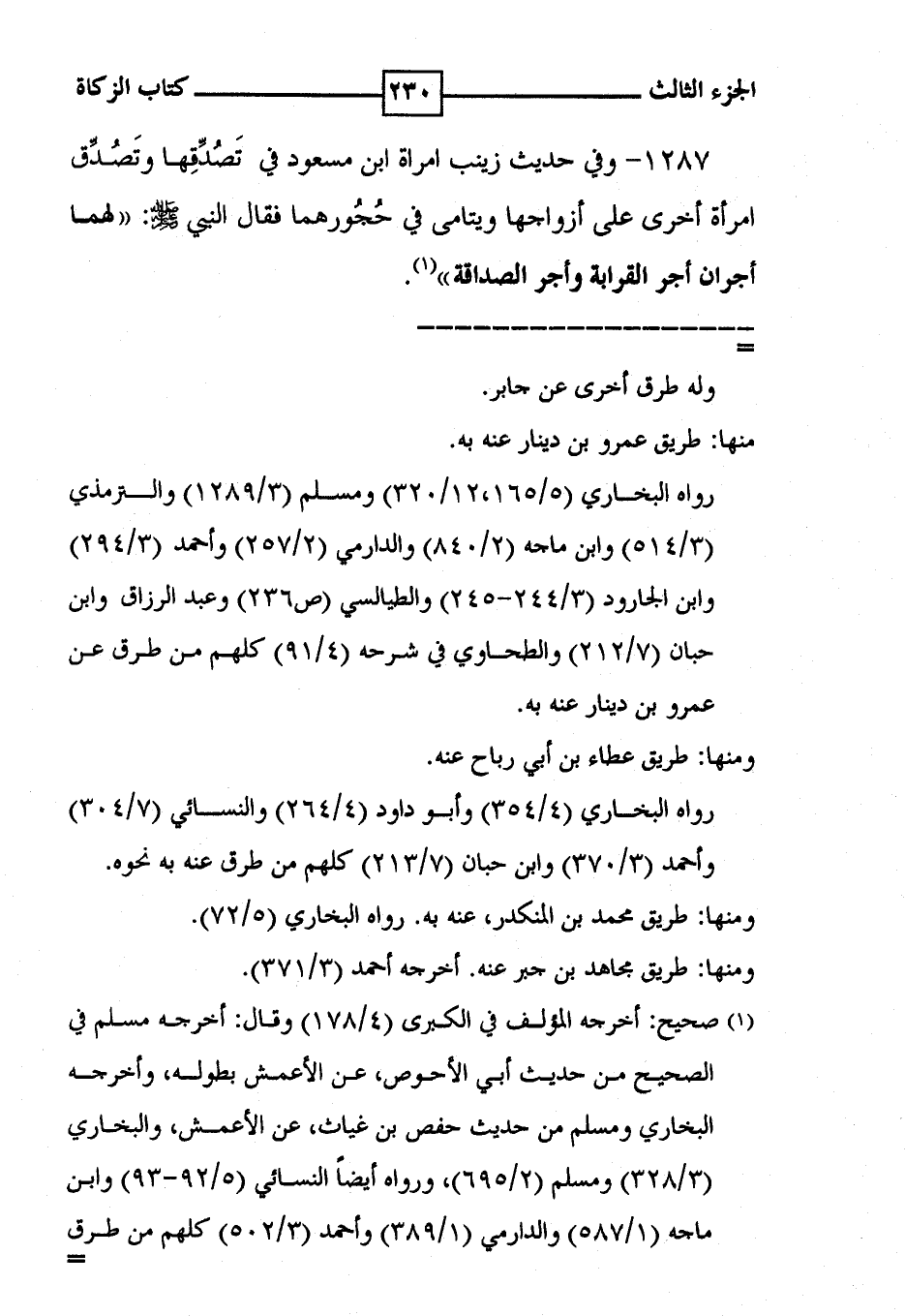 1287 - وفي حديث زينب امرأة ابن مسعود في تَصُدَّقِها وتَصُدَّق امرأة أخرى على أزواجها ويتامى في حجورهما فقال النبي [ صلى الله عليه وسلم ] : ' لهما أجران أجر القرابة وأجر الصداقة ' ( 1 ) .