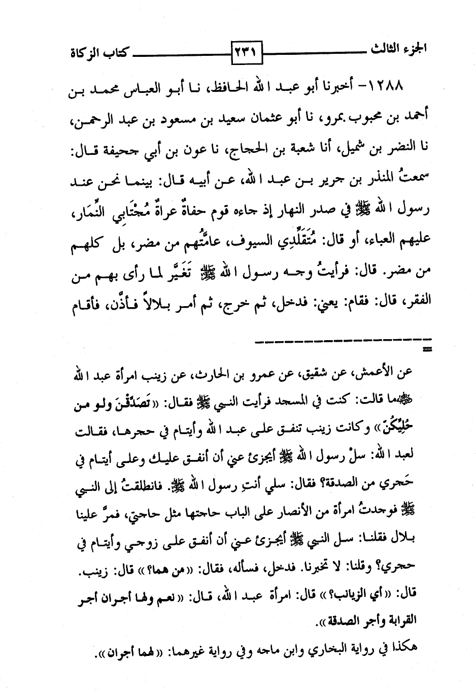 1288 - أخبرنا أبو عبد الله الحافظ ، نا أبو العباس محمد بن أحمد بن محبوب ، بمرو ، نا أبو عثمان سعيد بن مسعود بن عبد الرحمن ، نا النضر بن شميل ، أنا شعبة بن الحجاج ، ناعون بن أبي جحيفة قال : سمعتُ المنذر بن جرير بن عبد الله ، عن أبيه قال : بينما نحن عند رسول الله [ صلى الله عليه وسلم ] في صدر النهار إذ جاءه قوم حفاةُ عراةُ مُجْتَابيِ النَّمَار ، عليهم العباء ، أو قال : مُتَقَلَّدِي السيوف ، عامَّتُهم من مضر ، بل كلهم من مضر . قال : فرأيتُ وجه رسول الله [ صلى الله عليه وسلم ] تَغَيَّر لما رأى بهم من الفقر ، قال : فقام : يعني : فدخل ، ثم خرج ، ثم أمر بلالاً فأذَّن ، فأقام