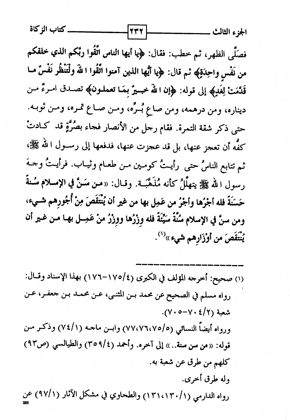 فصَلّى الظهر ، ثم خطب : فقال : ! ( يا أيها الناس اتقوا ربكم الذي خلقكم من نفس واحدة ) ! ثم قال : ! ( يا أيها الذين آمنوا اتقوا الله ولتنظر نفس ما قدمت لغد ) ! إلى قوله : ( إن الله خبيرُ بِمَا تعلمون ) تصدق امرءُ من ديناره ، ومن درهمه ، ومن صاعِ بُرَّه ، ومن صاع تمره ، ومن ثوبه . حتى ذكر شقة التمرة . فقام رجل من الأنصار فجاء بصُرَّةٍ قد كادتْ كفُّه أن تعجز عنها ، بل قد عجزت عنها ، فدفعها إلى رسول الله [ صلى الله عليه وسلم ] ، ثم تتابع الناسُ حتى رأيتُ كومين من طعام وثياب . فرأيتُ وجهَ رسول الله [ صلى الله عليه وسلم ] يتهلَّلُ كأنه مُذَهَّبة . وقال : ' من سَنَّ في الإسلام سُنةً حَسَنَةٌ فله أجْرُها وأجْرُ من عَمِل بها من غير أن يُنْتَقَصَ مِنْ أُجُورِهم شيء ، ومن سنَّ في الإسلام سُنَّةٌ سيئة فله وِزُرُها ووِزْرُ منْ عَمِل بها من غير أن يُنْتَقَص من أوزَارِهم شيء ' ( 1 ) .