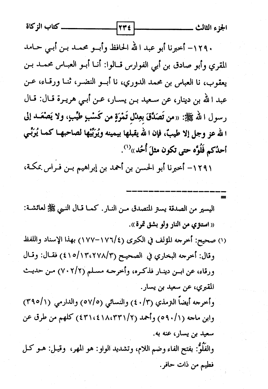 1290 - أخبرنا أبو عبد الله الحافظ وأبو محمد بن أبي حامد المقري وأبو صادق بن أبي الفوارس قالوا : أنا أبو العباس محمد بن يعقوب ، نا العباس بن محمد الدوري ، نا أبو النضر ، ثنا ورقاء ، عن عبد الله بن دينار ، عن سعيد بن يسار ، عن أبي هريرة قال : قال رسول الله [ صلى الله عليه وسلم ] : ' من تَصَدَّقَ بِعِدْل تمرة من كَسٌ بٍ طيَّبٍ ولا يَصْعَد إلى الله عز وجل إلا طيبُ ، فإن الله يقبلها بيمينه ويُرَبَّيْها لصاحبها كما يُرَبَّي أحدُكم فَلُوَّه حتى تكون مثلَ أُحُد ' ( 1 ) .