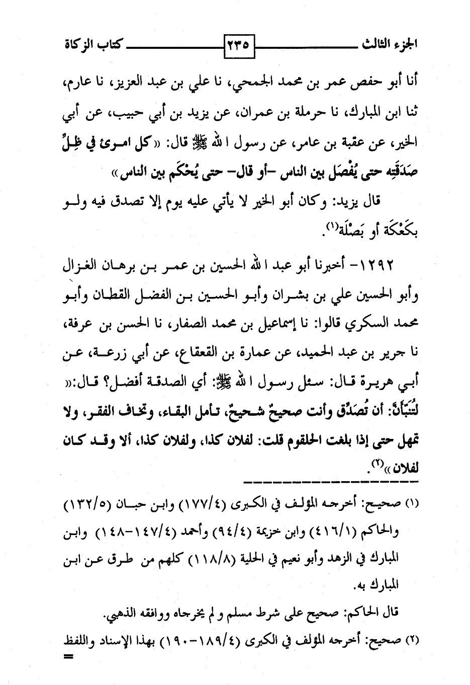1292 - أخبرنا أبو عبد الله الحسين بن عمر بن برهان الغزال وأبو الحسين علي بن بشران وأبو الحسين بن الفضل القطان وأبو محمد السكري قالوا : نا إسماعيل بن محمد الصفار ، نا الحسن بن عرفة ، نا جرير بن عبد الحميد ، عن عمارة بن القعقاع ، عن أبي زرعة ، عن أبي هريرة قال : سئل رسول الله [ صلى الله عليه وسلم ] : أي الصدقة أفضل ؟ قال : ' لتُنَبّأَنَّ : أن تُصَدَّق وأنت صحيح شحيحُ ، تأمل البقاء ، وتخاف الفقر ، ولا تمهل حتى إذا بلغت الحلقوم قلت : لفلان كذا ، ولفلان كذا ، ألا وقد كان لفلان ' ( 2 ) .