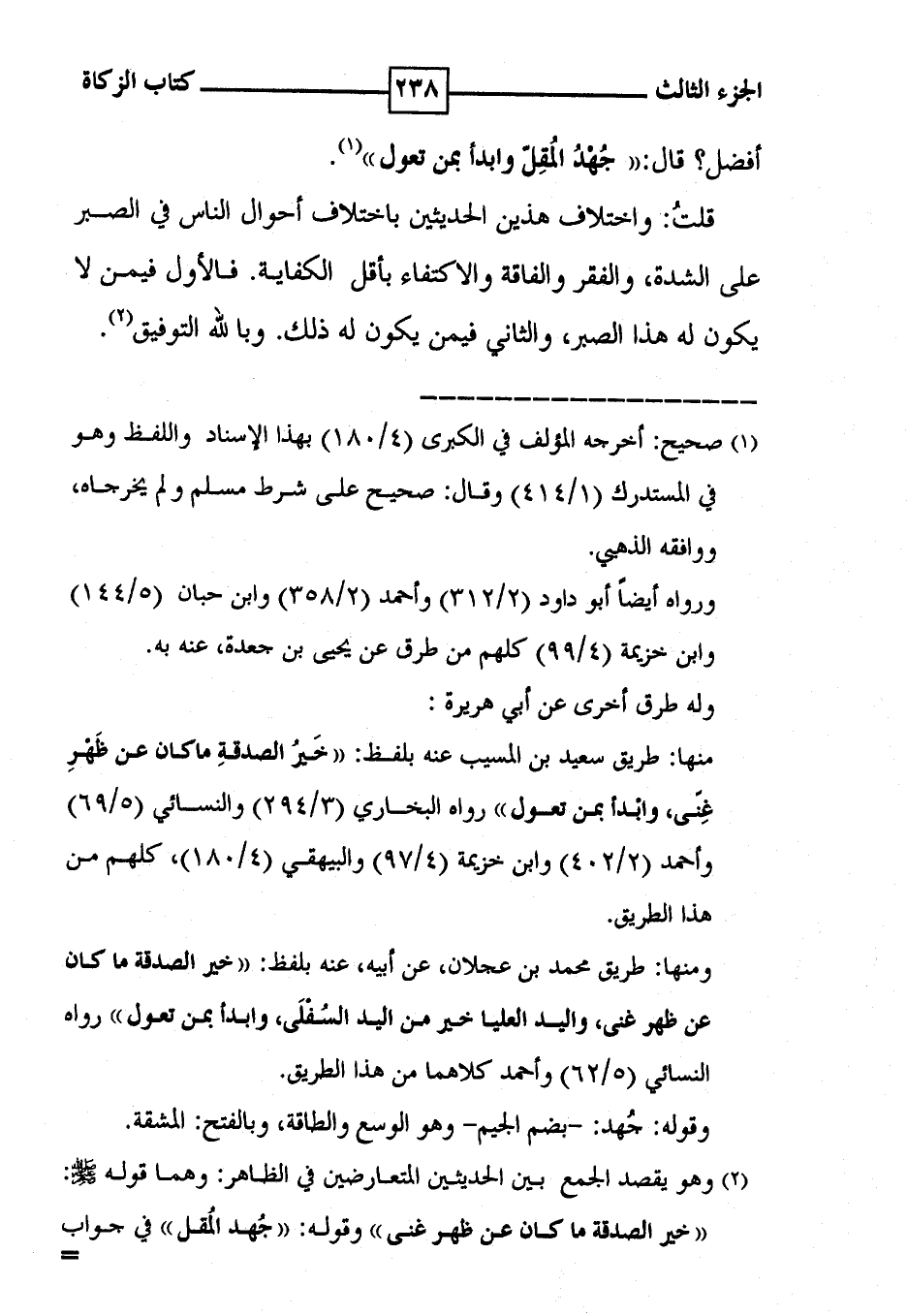 أفضل ؟ قال : ' جُهْدُ المُقِلّ وابدأ بمن تعول ' ( 1 ) . قلتُ : واختلاف هذين الحديثين باختلاف أحوال الناس في الصبر على الشدة ، والفقر والفاقة والاكتفاء بأقل الكفاية . فالأول فيمن لا يكون له هذا الصبر ، والثاني فيمن يكون له ذلك . و بالله التوفيق ( 2 ) .
