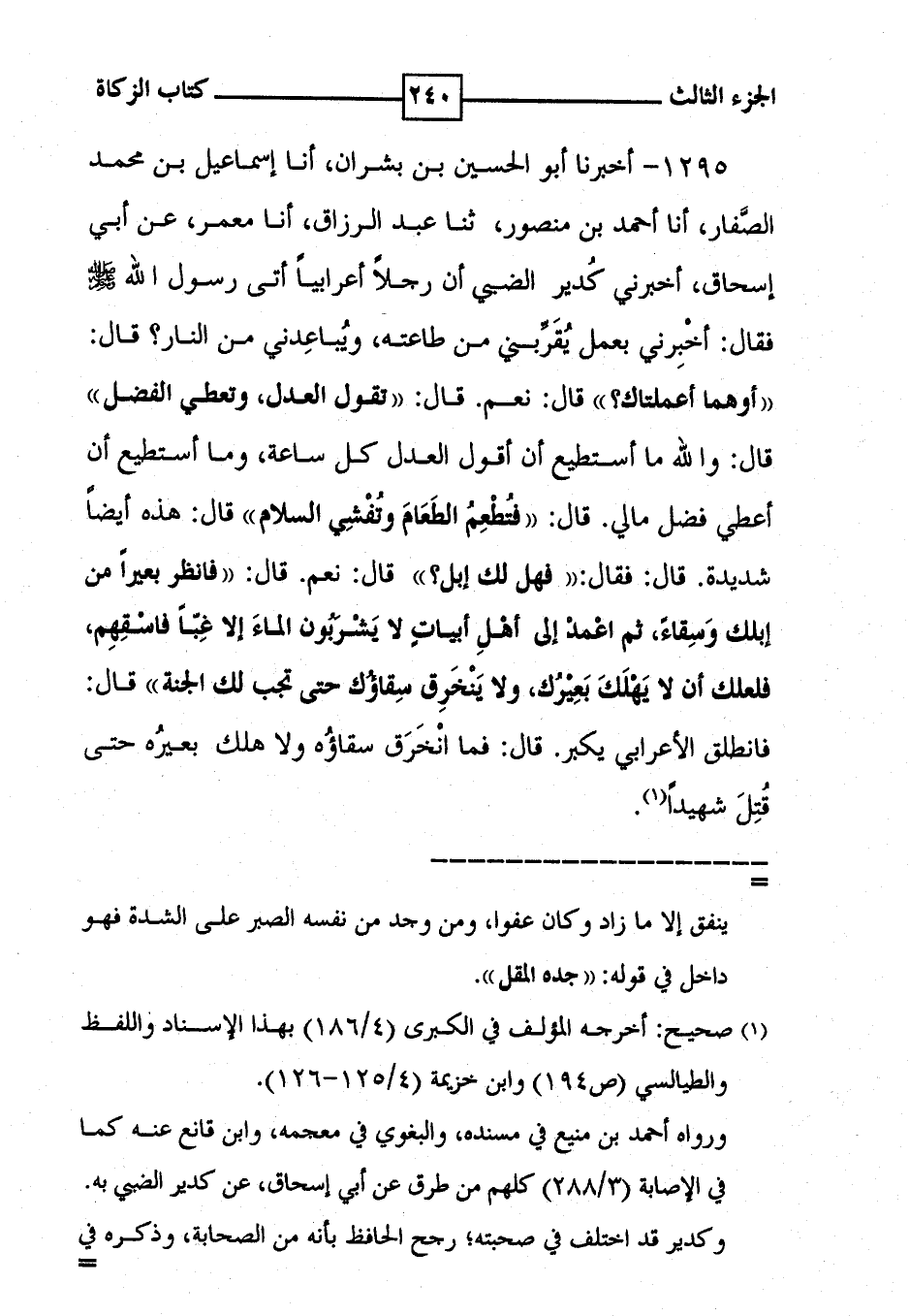 1295 - أخبرنا أبو الحسين بن بشران ، أنا إسماعيل بن محمد الصَّفار ، أنا أحمد بن منصور ، ثنا عبد الرزاق ، أنا معمر ، عن أبي إسحاق ، اخبرني كُدير الضبي أن رجلاً أعرابياً أتى رسول الله [ صلى الله عليه وسلم ] فقال : أخْبِرني بعمل يُقَرَّبني من طاعته ، ويُباعِدني من النار ؟ قال : ' أوهما أعملتاك ؟ ' قال : نعم . قال : ' تقول العدل ، وتعطي الفضل ' ' قال : والله ما أستطيع أن أقول العدل كل ساعة ، وما أستطيع أن أعطي فضل مالي . قال : ' فُتطْعِمُ الطَعَامَ وتُفْشِي السلام ' قال : هذه أيضاً شديدة . قال : فقال : ' فهل لك إبل ؟ ' قال : نعم . قال : ' فانظر بعيراً من إبلك وَسِقاءً ، ثم اعْمدْ إلى أهْلِ أبياتٍ لا يَشْرَبُون الماءَ إلا غِبّاً فاسْقِهِم ، فلعلك أن لا يَهْلَكَ بَعِيْرُك ، ولا يَنْخَرِق سِقاؤُك حتى تجب لك الجنة ' قال : فانطلق الأعرابي يكبر . قال : فما انْخَرَق سقاؤُه ولا هلك بعيرُه حتى قُتِلَ شهيداً ( 1 ) .