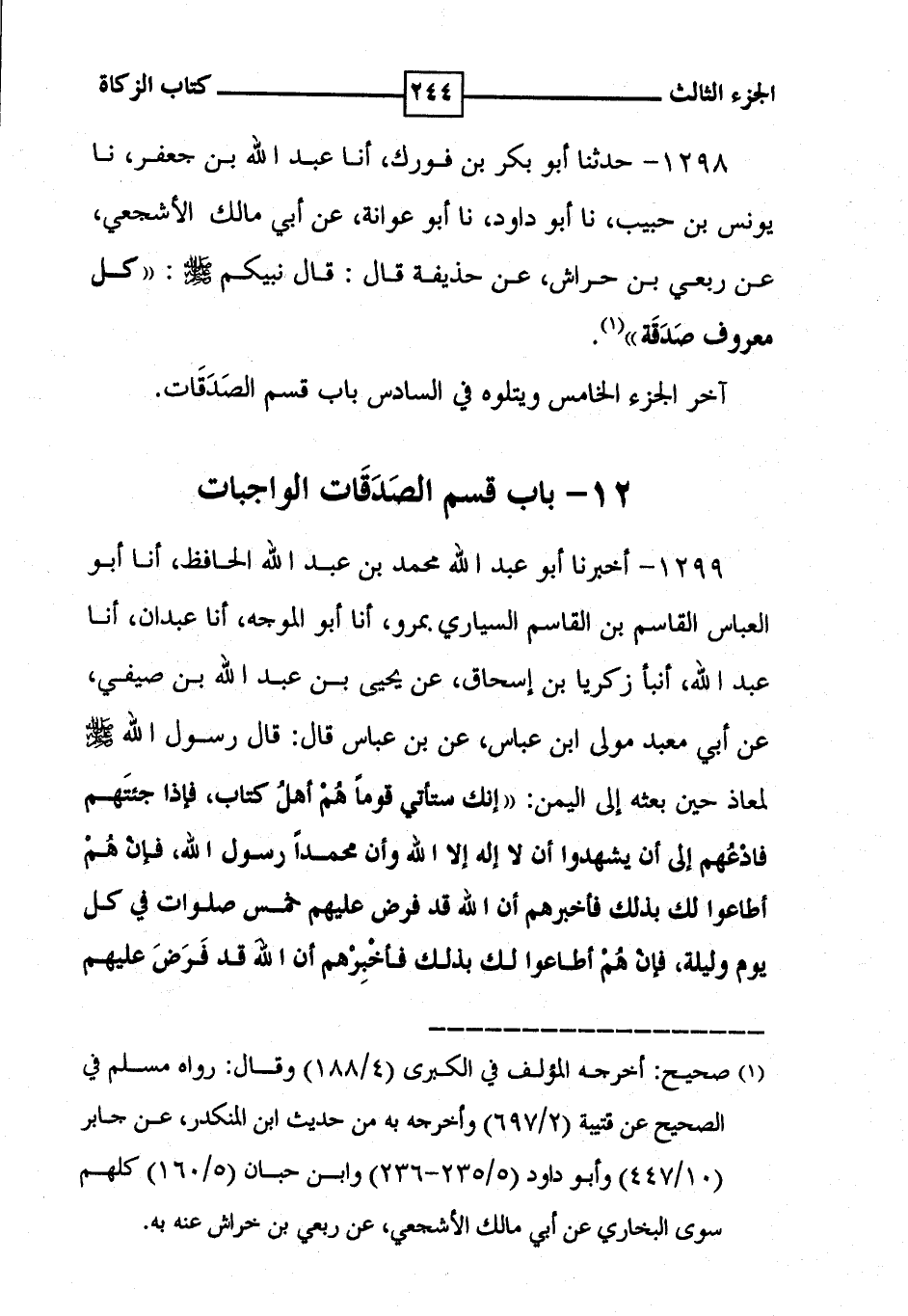 1298 - حدثنا أبو بكر بن فورك ، أنا عبد الله بن جعفر ، نا يونس بن حبيب ، نا أبو داود ، نا أبو عوانة ، عن أبي مالك الأشجعي ، عن ربعي بن حراش ، عن حذيفة قال : قال نبيكم [ صلى الله عليه وسلم ] : ' كل معروف صَدَقَة ' ( 1 ) . آخر الجزء الخامس ويتلوه في السادس باب قسم الصَدَقَات . ( 12 - باب قسم الصَدَقَات الواجبات ) 1299 - أخبرنا أبو عبد الله محمد بن عبد الله الحافظ ، أنا أبو العباس القاسم بن القاسم السياري . بمرو ، أنا أبو الموجه ، أنا عبدان ، أنا عبد الله ، أنبأ زكريا بن إسحاق ، عن يحيى بن عبد الله بن صيفي ، عن أبي معبد مولى ابن عباس ، عن بن عباس قال : قال رسول الله [ صلى الله عليه وسلم ] لمعاذ حين بعثه إلى اليمن : ' إنك ستأتي قوماً هُمْ أهلُ كتاب ، فإذا جئتَهم فادْعُهم إلى أن يشهدوا أن لا إله إلا الله وأن محمداً رسول الله ، فإن هُمْ أطاعوا لك بذلك فأخبرهم أن الله قد فرض عليهم خمس صلوات في كل يوم وليلة ، فإن هُمْ أطاعوا لك بذلك فأخْبِرْهم أن الله قد فَرَضَ عليهم