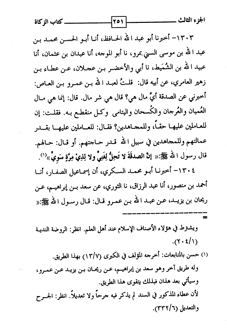 1303 - أخبرنا أبو عبد الله الحافظ ، أنا أبو الحسن محمد بن عبد الله بن موسى السني ، بمرو ، نا أبو الموجه ، أنا عبدان بن عثمان ، أنا عبيد الله بن الشُمَيط ، نا أبي والأخضر بن عجلان ، عن عطاء بن زهير العامري ، عن أبيه قال : قلتُ لعبد الله بن عمرو بن العاص : أخبرني عن الصدقة أيَّ مال هي ؟ قال هي شر مال . قال : إنما هي مال العُميان والعُرجان والكُسحان واليتامى وكل منقطع به . فقلت : إن للعاملين عليها حقاً ، وللمجاهدين ؟ فقال : للعاملين عليها بقدر عمالتهم وللمجاهدين في سبيل الله قدر حاجتهم . أو قال : حالهم . قال رسول الله [ صلى الله عليه وسلم ] : ' إنَّ الصدقَةَ لا تَحِلُّ لِغَنِيّ ولا لذيْ مِرَّةٍ سَوِيَّ ' ( 1 ) .