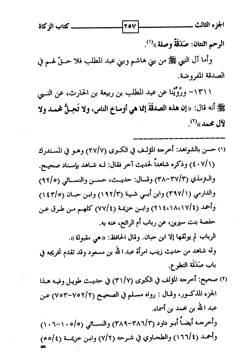 1311 - ورُوِّيْنا عن عبد المطلب بن ربيعة بن الحارث ، عن النبي [ صلى الله عليه وسلم ] أنه قال : ' إن هذه الصدقة إنما هي أوساخ الناس ، ولا تَحِلُّ لمحمد ولا لآل محمد ' ( 2 ) .