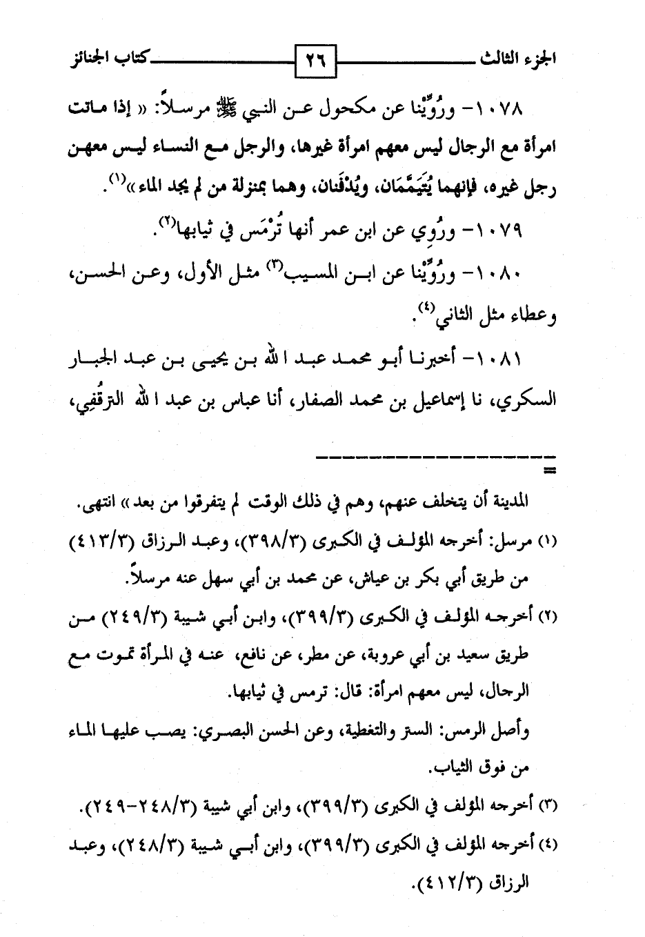 1078 - ورُوِّيْنا عن مكحول عن النبي [ صلى الله عليه وسلم ] مرسلاً : ' إذا ماتت امرأة مع الرجال ليس معهم امرأة غيرها ، والرجل مع النساء ليس معهن رجل غيره ، فإنهما يُتَيمَّمَان ، ويُدْفَنان ، وهما بمنزلة من لم يجد الماء ' ( 1 ) .