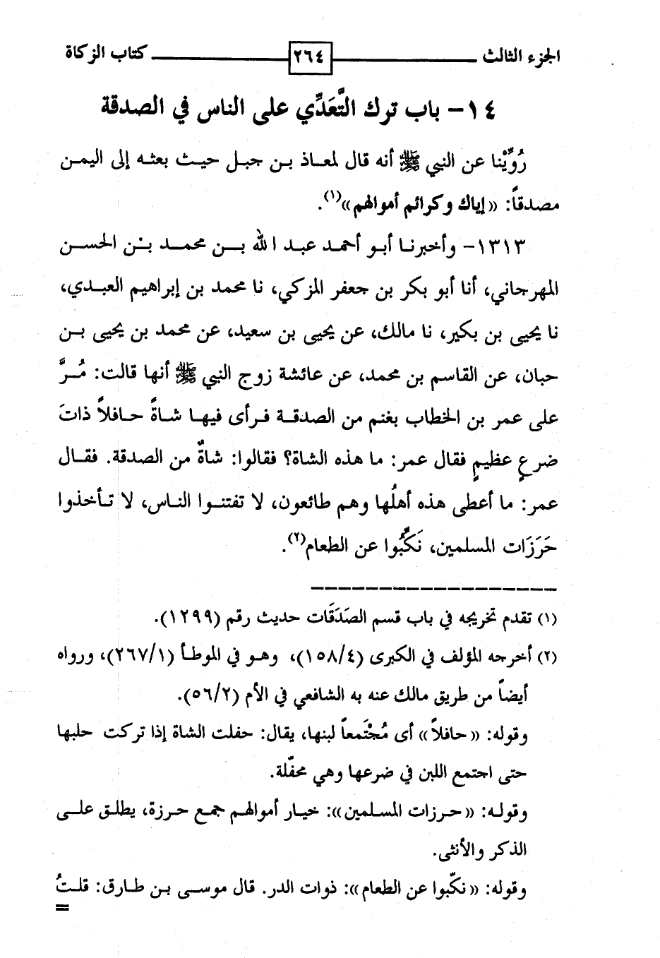 ( 14 - باب ترك الَّتعَدي على الناس في الصدقة ) رُوِّيْنا عن النبي [ صلى الله عليه وسلم ] أنه قال لمعاذ بن جبل حيث بعثه إلى اليمن مصدقاً : ' إياك وكرائم أموالهم ' ( 1 ) .