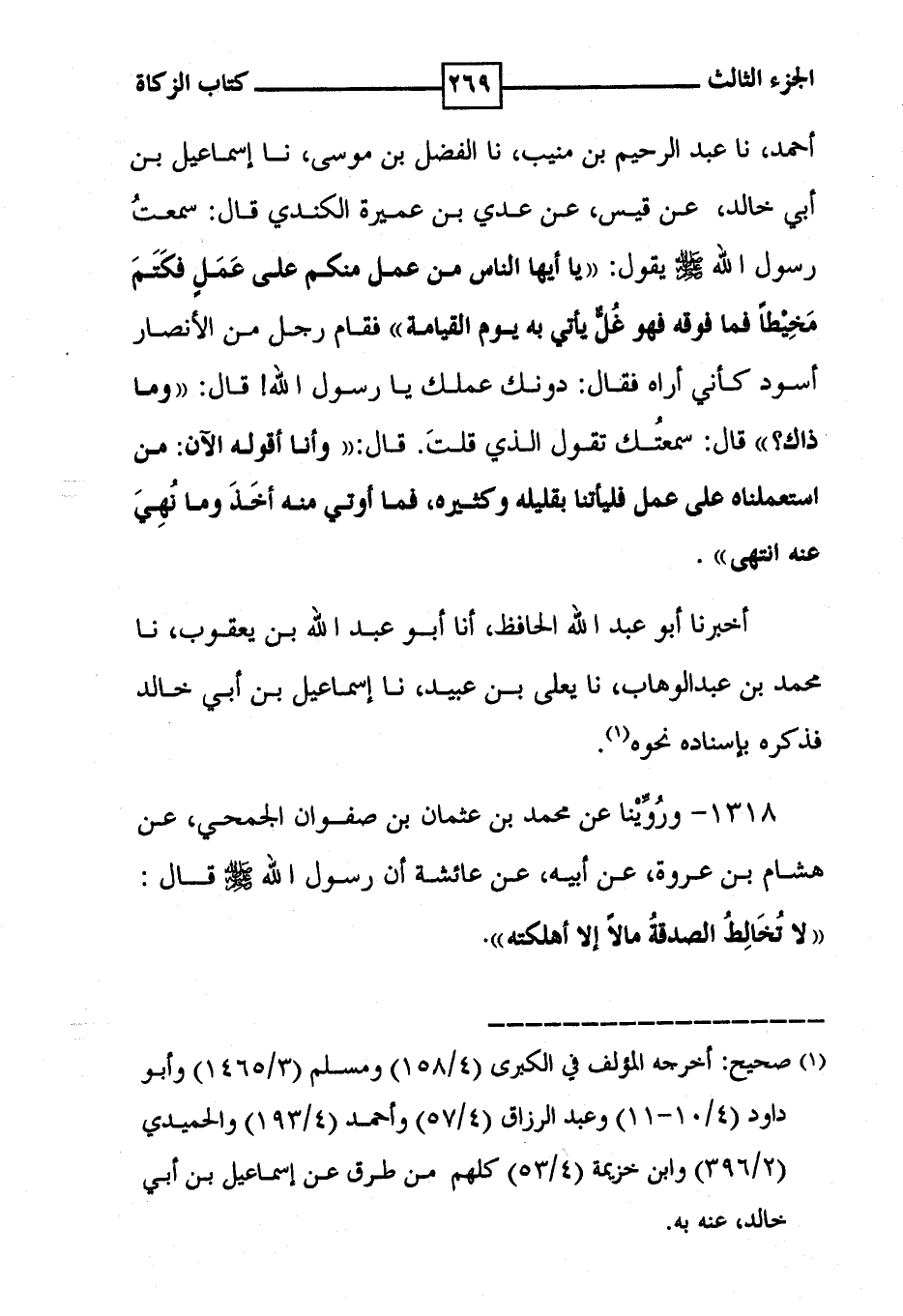 1318 - ورُوَّيْنا عن محمد بن عثمان بن صفوان الجمعي ، عن هشام بن عروة ، عن أبيه ، عن عائشة أن رسول الله [ صلى الله عليه وسلم ] قال : ' لا تخالط الصدقةُ مالاً إلا أهلكته ' .