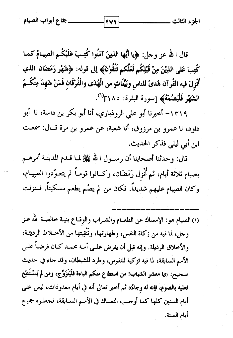 1319 - أخبرنا أبو علي الروذباري ، أنا أبو بكر بن داسة ، نا أبو داود ، نا عمرو بن مرزوق ، أنا شعبة ، عن عمرو بن مرة قال : سمعت ابن أبي ليلى فذكر الحديث . قال : وحدثنا أصحابنا أن رسول الله [ صلى الله عليه وسلم ] لما قدم المدينة أمرهم بصيام ثلاثة أيام ، ثم أنزل رَمَضَانَ ، وكانوا قوماً لم يتعوّدوا الصيام ، وكان الصيام عليهم شديداً . فكان من لم يصُم يطعم مسكينا . فنزلت