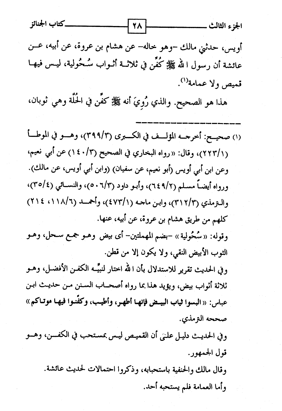أويس ، حدثني مالك - وهو خاله - عن هشام بن عروة - عن أبيه ، عن عائشة أن رسول الله [ صلى الله عليه وسلم ] كُفن في ثلاثة أثواب سُحُولية ، ليس فيها قميص ولا عمامة ( 1 ) . هذا هو الصحيح . والذي رُوِيَ أنه [ صلى الله عليه وسلم ] كفِّن في الحُلَّة وهي ثوبان