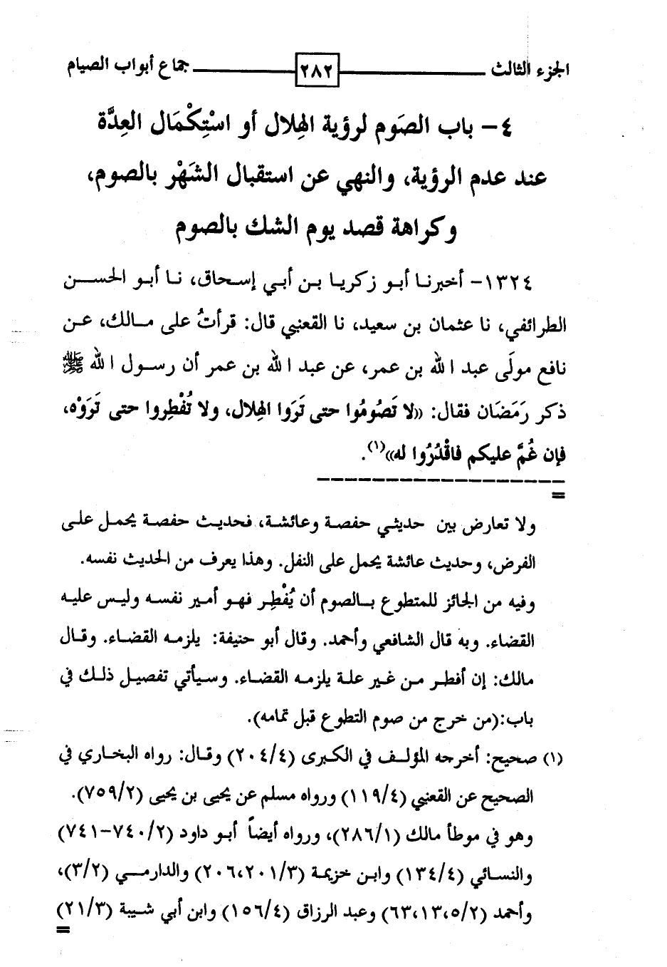 1324 - أخبرنا أبو زكريا بن أبي إسحاق ، نا أبو الحسن الطرائفي ، نا عثمان بن سعيد ، نا القعنبي قال : قرأتُ على مالك ، عن نافع مولَى عبد الله بن عمر ، عن عبد الله بن عمر أن رسول الله [ صلى الله عليه وسلم ] ذكر رَمَضَان فقال : ' لا تَصُومُوا حتى تَرَوا الهِلال ، ولا تُفْطِروا حتى تَرَوْه ، فإن غُمَّ عليكم فاقْدُرْوا له ' ( 1 ) .