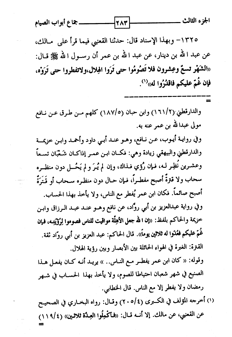 1325 - وبهذا الإسناد قال : حدثنا القعنبي فيما قرأ على مالك ، عن عبد الله بن دينار ، عن عبد الله بن عمر أن رسول الله [ صلى الله عليه وسلم ] قال : ' الشَهْر تسعٌ وعِشرون فلا تَصُومُوا حتى تَروَا الهِلال ، ولا تفطروا حتى تَرَوْه ، فإن غُمَّ عليكم فاقدُرُوا له ' ( 1 ) .