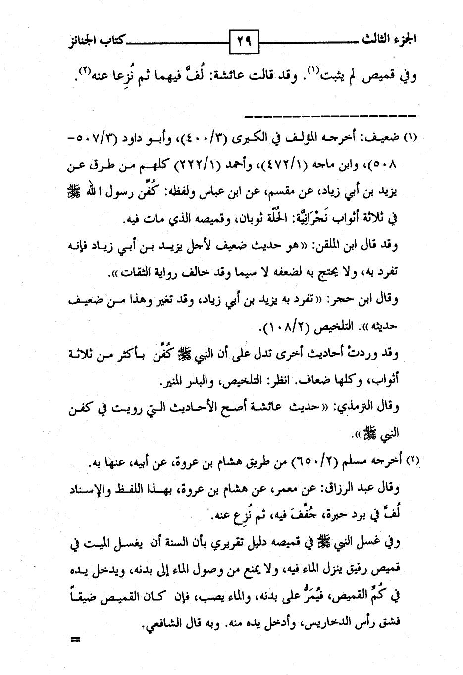 وفي قميص لم يثبت ( 1 ) . وقد قالت عائشة : لُفَّ فيهما ثم نُزِعا عنه ( 2 ) .