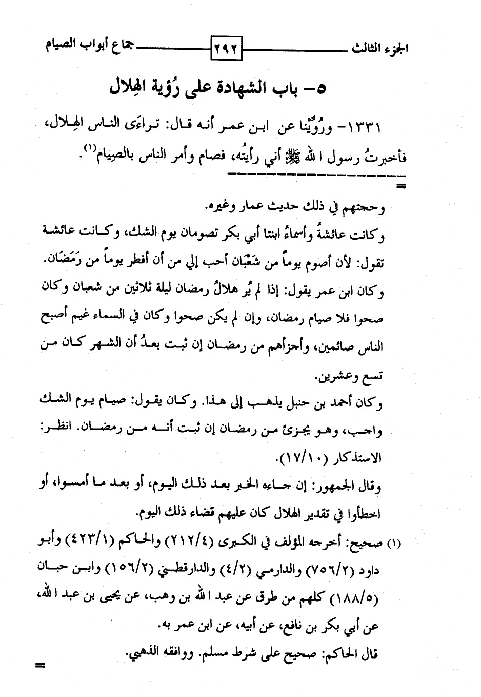 1331 - ورُوِّيْنا عن ابن عمر أنه قال : تراءَى الناس الهِلال ، فأخبرتُ رسول الله [ صلى الله عليه وسلم ] أني رأيتُه ، فصام وأمر الناس بالصِيام ( 1 ) .