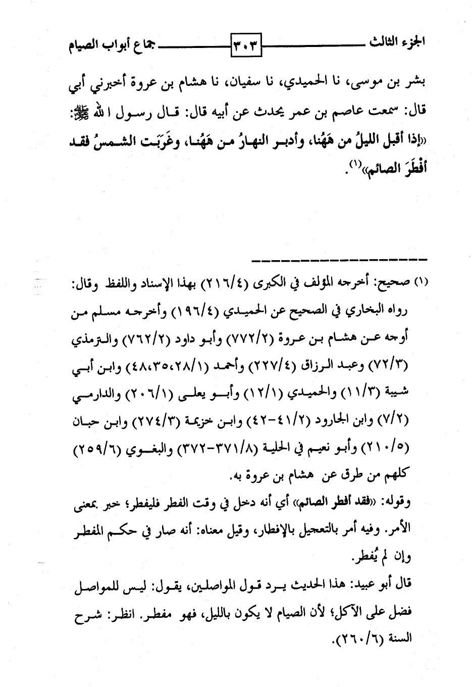 بشر بن موسى ، نا الحميدي ، نا سفيان ، نا هشام بن عروة أخبرني أبي قال : سمعت عاصم بن عمر يحدث عن أبيه قال : قال رسول الله [ صلى الله عليه وسلم ] : ' إذا أقبل الليلُ من هَهُنا ، وأدبر النهارُ من هَهُنا ، وغَرَبَت الشمسُ فقد أفْطَرَ الصائم ' ( 1 ) .
