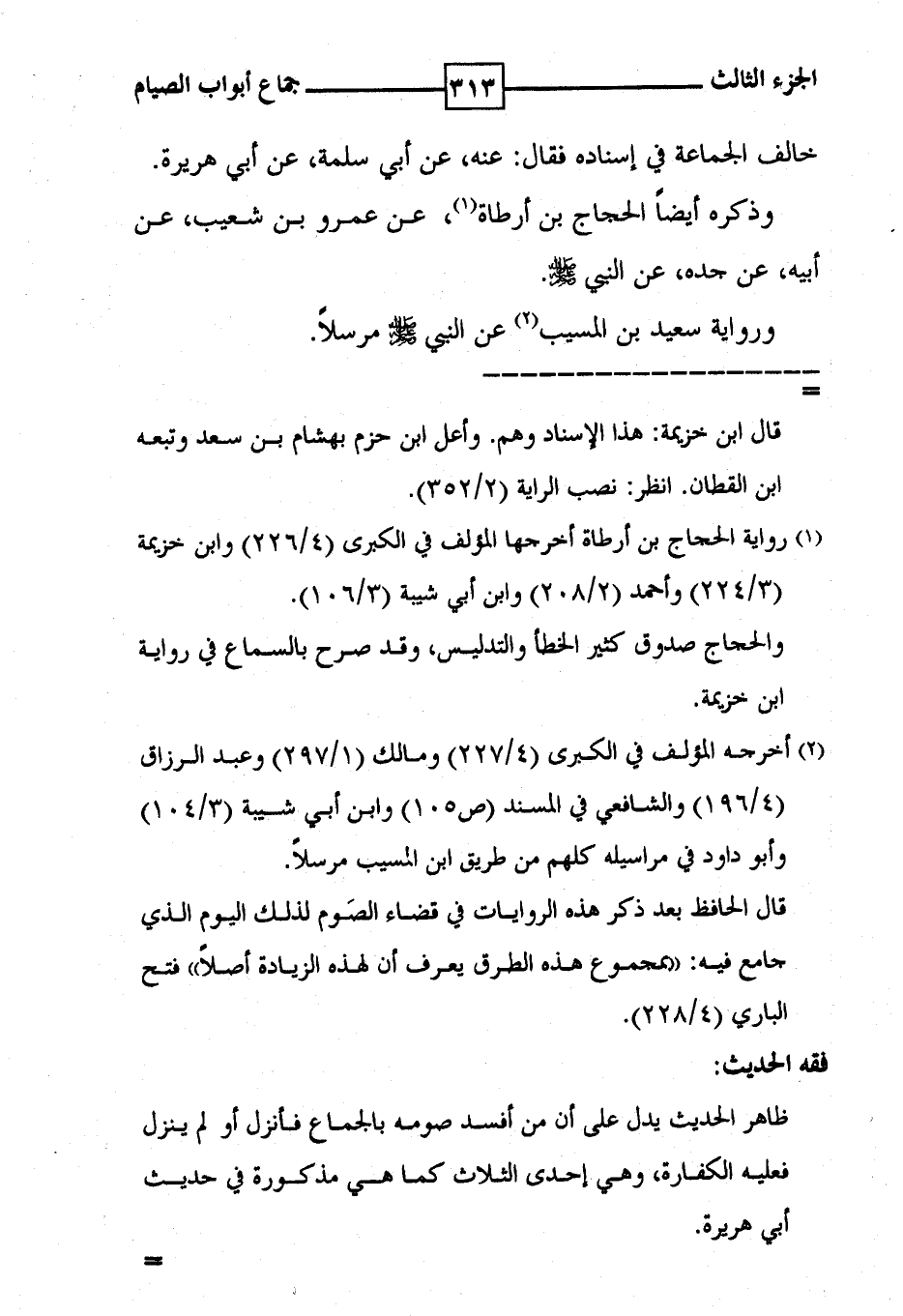 خالف الجماعة في إسناده فقال : عنه ، عن أبي سلمة ، عن أبي هريرة . وذكره أيضاً الحجاج بن أرطاة ( 1 ) ، عن عمرو بن شعيب ، عن أبيه ، عن جده ، عن النبي [ صلى الله عليه وسلم ] . ورواية سعيد بن المسيب ( 2 ) عن النبي [ صلى الله عليه وسلم ] مرسلاً .