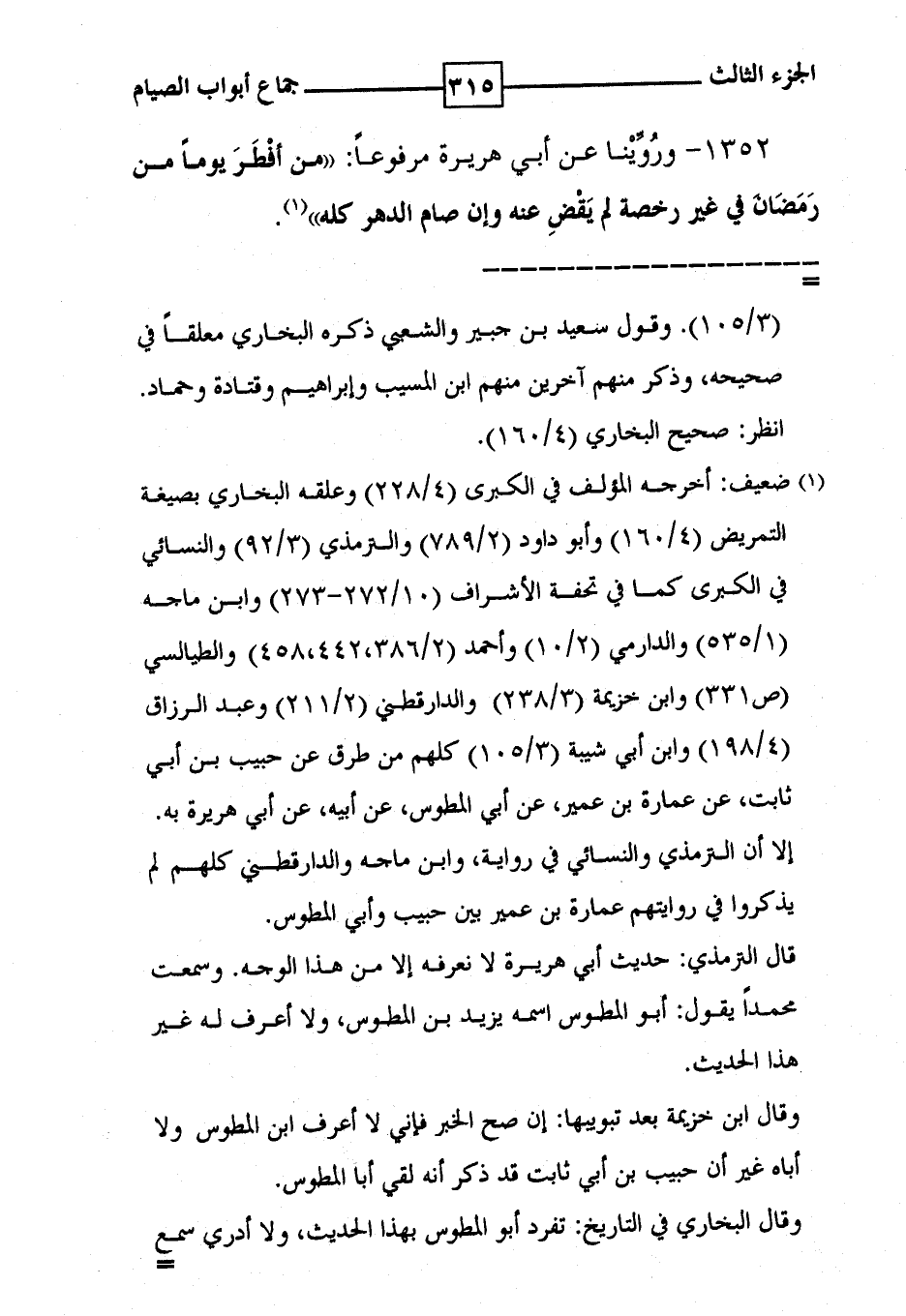 1352 - ورُوِّيْنا عن أبي هريرة مرفوعاً : ' من أفْطَرَ يوماً من رَمَضَانَ في غير رخصة لم يَقْضِ عنه وإن صام الدهر كله ' ( 1 ) .