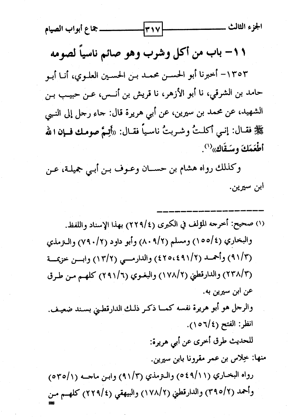 1353 - أخبرنا أبو الحسن محمد بن الحسين العلوي ، أنا أبو حامد بن الشرقي ، نا أبو الأزهر ، نا قريش بن أنس ، عن حبيب بن الشهيد ، عن محمد بن سيرين ، عن أبي هريرة قال : جاء رجل إلى النبي [ صلى الله عليه وسلم ] فقال : إني أكلتُ وشربتُ ناسياً فقال : ' أَتِمَّ صومك فإن الله أطْعَمَكَ وسَقَاك ' ( 1 ) . وكذلك رواه هشام بن حسان وعوف بن أبي جميلة ، عن ابن سيرين .