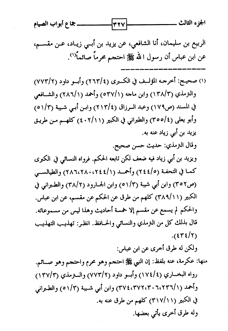 الربيع بن سليمان ، أنا الشافعي ، عن يزيد بن أبي زياد ، عن مقسم ، عن ابن عباس أن رسول الله [ صلى الله عليه وسلم ] احتجم محرماً صائماً ( 1 ) .