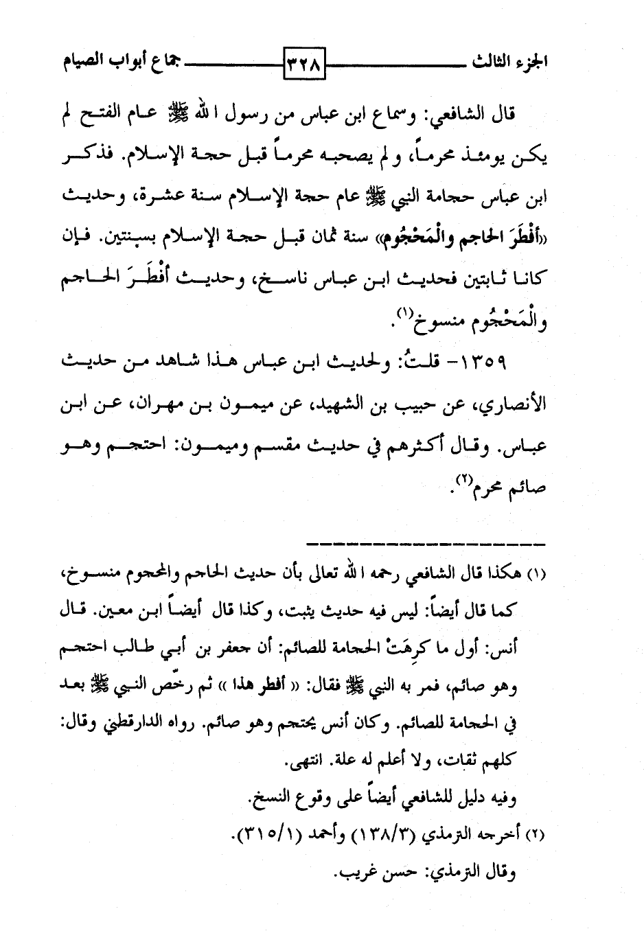 1359 - قلتُ : ولحديث ابن عباس هذا شاهد من حديث الأنصاري ، عن حبيب بن الشهيد ، عن ميمون بن مهران ، عن ابن عباس . وقال أكثرهم في حديث مقسم وميمون : احتجم وهو صائم محرم ( 2 ) .