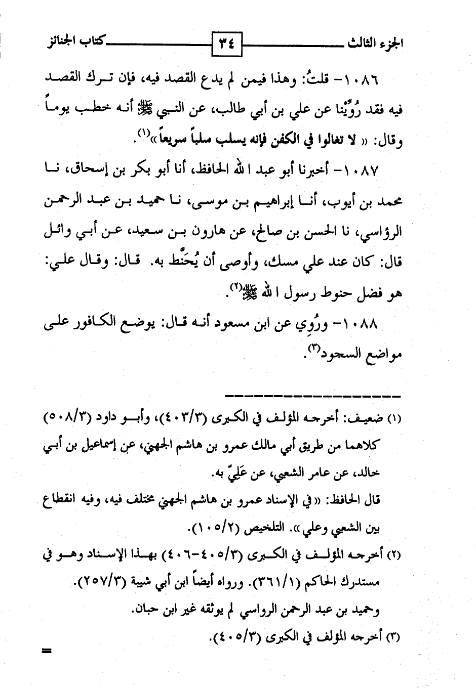 1086 - قلتُ : وهذا فيمن لم يدع القصد فيه ، فإن ترك القصد فيه فقد رُوَّينا عن علي بن أبي طالب ، عن النبي [ صلى الله عليه وسلم ] أنه خطب يوماً وقال : ' لا تغالوا في الكفن فإنه يسلب سلباً سريعاً ' ( 1 ) .