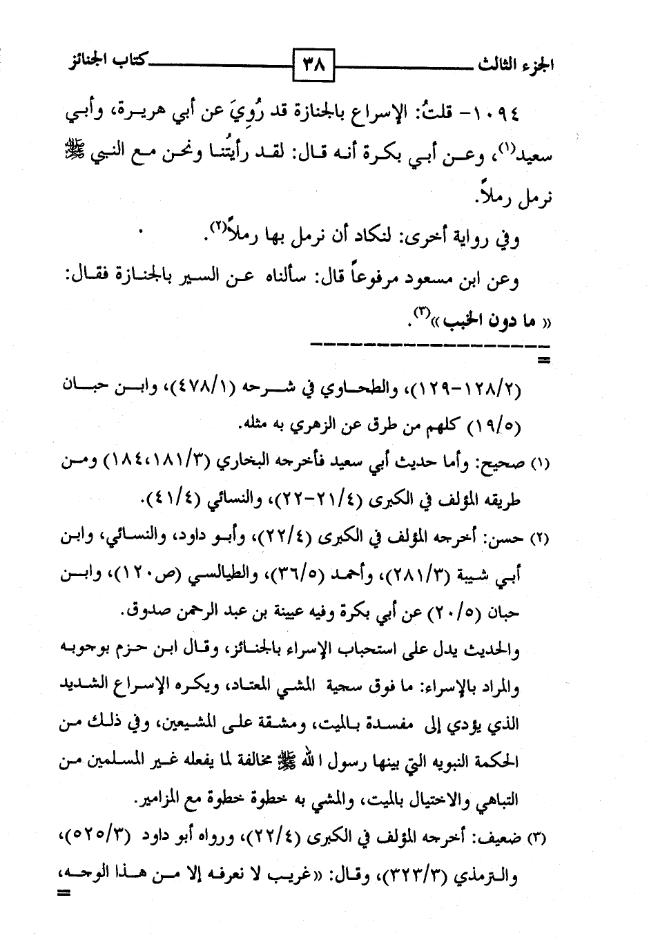 1094 - قلتُ : الإسراع بالجنازة قد رُوِيَ عن أبي هريرة ، وأبي سعيد ( 1 ) ، وعن أبي بكرة أنه قال : لقد رأيتُنا ونحن مع النبي [ صلى الله عليه وسلم ] نرمل رملاً . وفي رواية أخرى : لنكاد أن نرمل بها رملاً ( 2 ) . وعن ابن مسعود مرفوعاً قال : سألناه عن السير بالجنازة فقال : ' ما دون الخبب ' ( 3 ) .