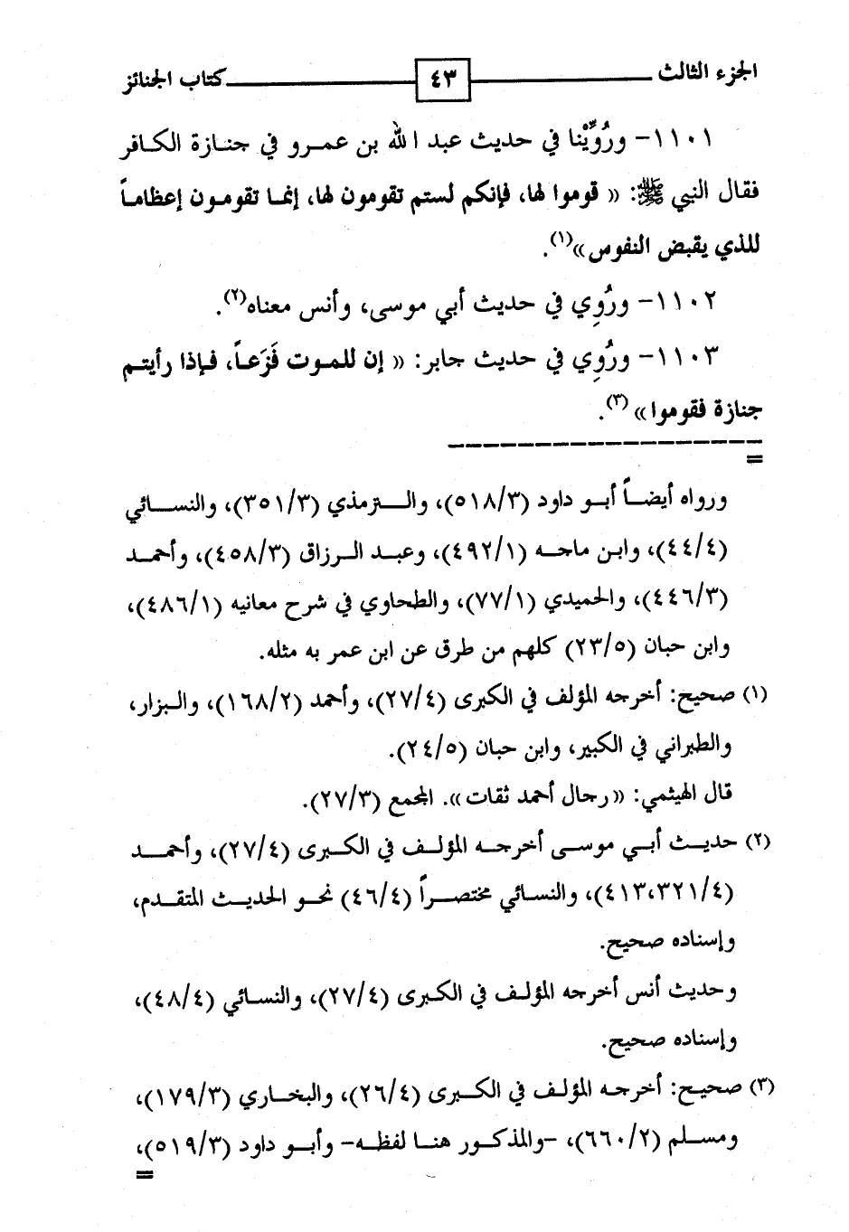 1101 - ورُوِّيْنا في حديث عبد الله بن عمرو في جنازة الكافر فقال النبي [ صلى الله عليه وسلم ] : ' قوموا لها ، فإنكم لستم تقومون لها ، إنما تقومون إعظاماً للذي يقبض النفوس ' ( 1 ) .