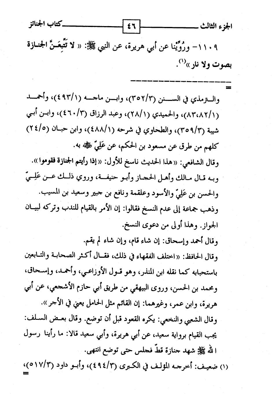 1109 - ورُوِّيْنا عن أبي هريرة ، عن النبي [ صلى الله عليه وسلم ] : ' لا تَتَّبِعَنَّ الجنازة بصوت ولا نار ' ( 1 ) .